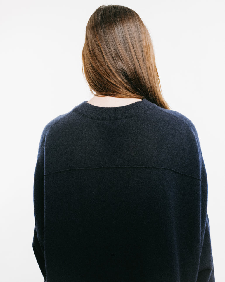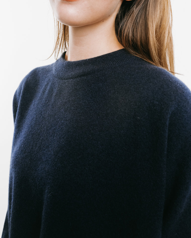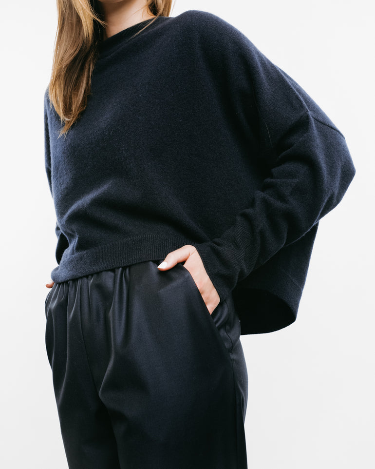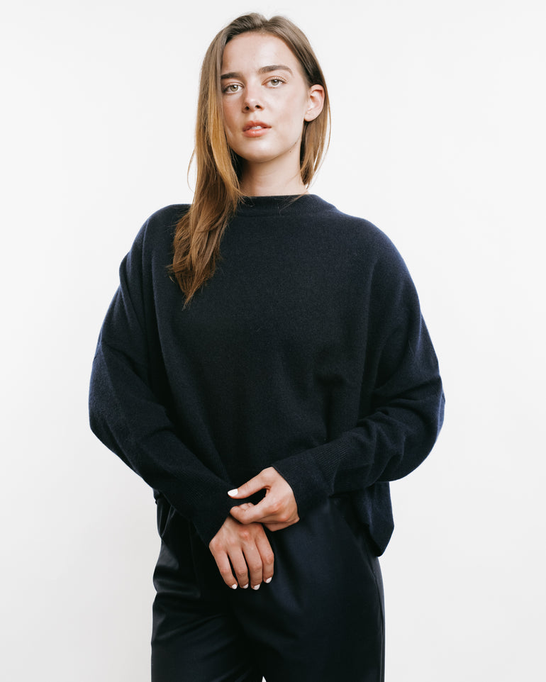 Sweater with round neckline, dropped shoulders and dolman sleeves.