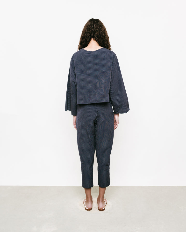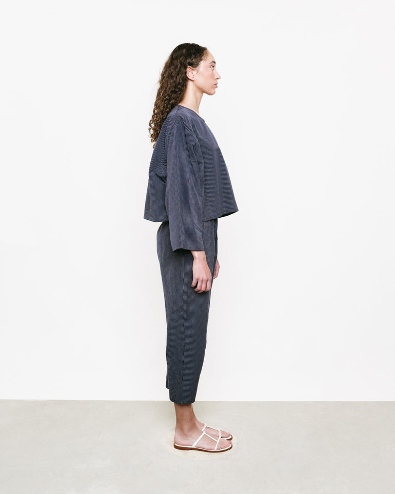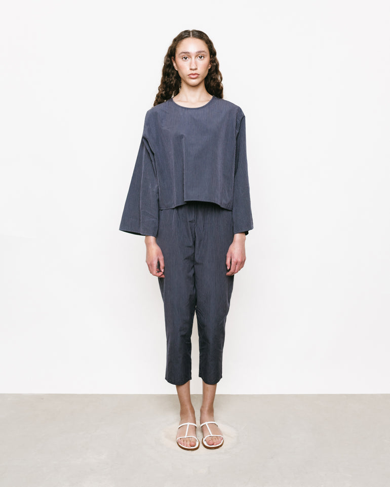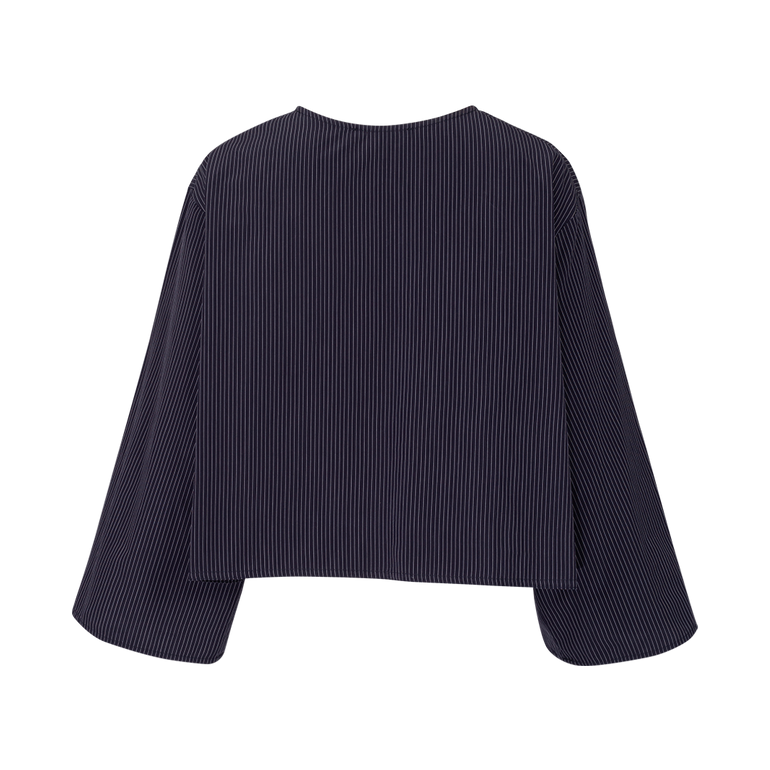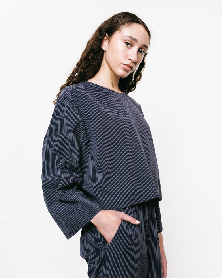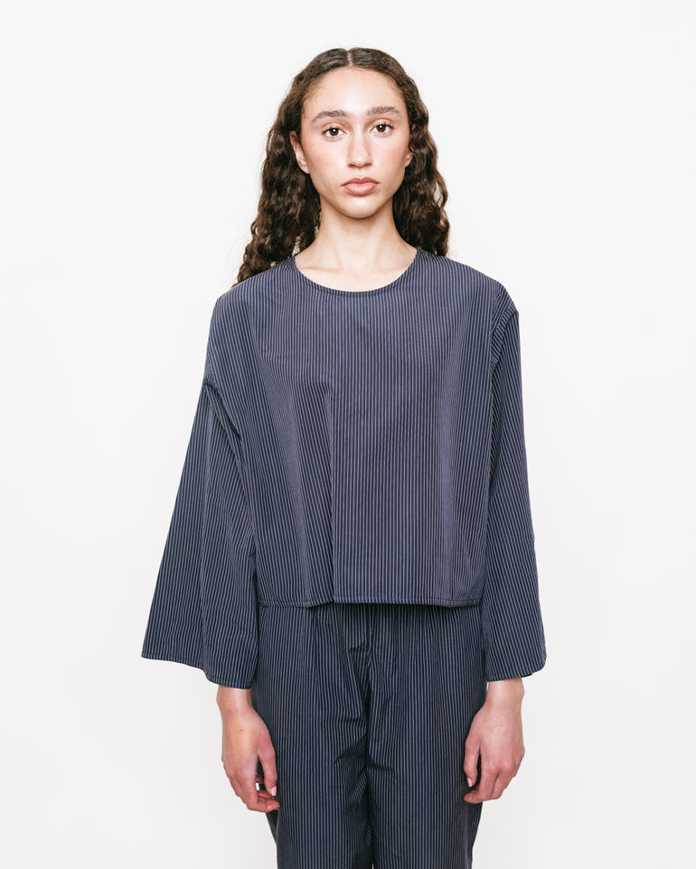 Boxy shirt with round neckline, dropped shoulder and cropped, wide sleeves.