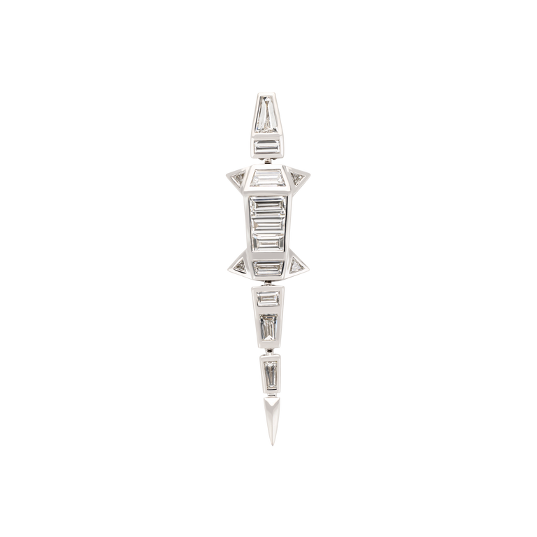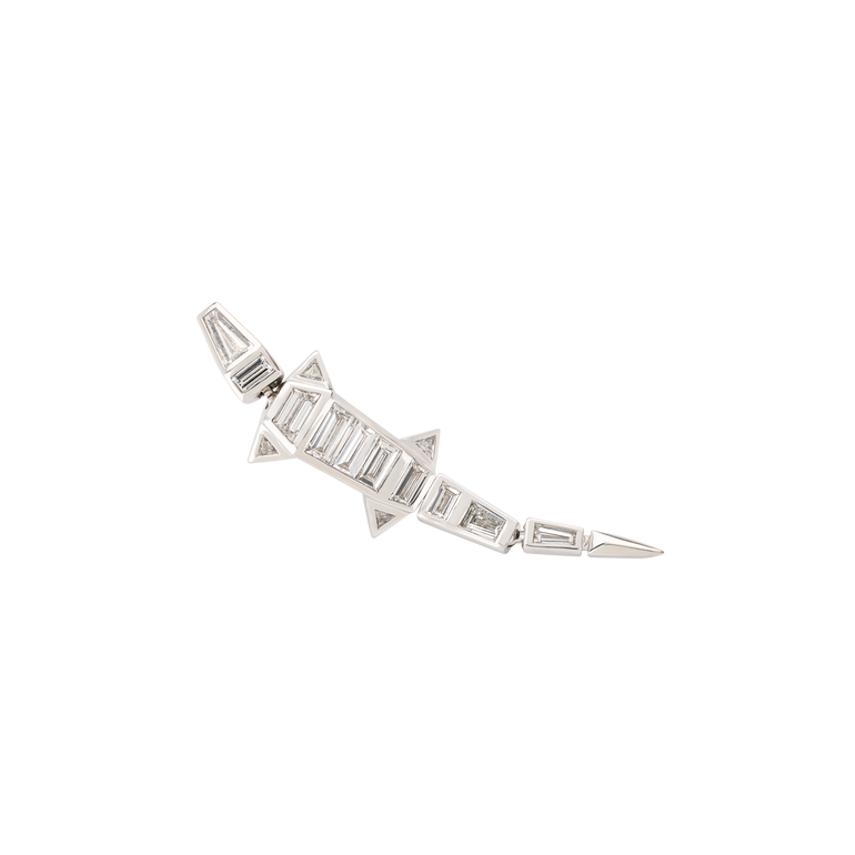 Alligator earring, body of the alligator is crafted from white gold and set with baguette-cut diamonds, round push-backs for pierced ears.