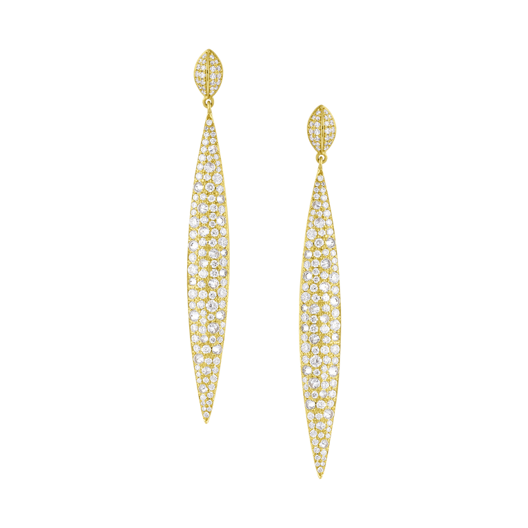 Elongated drop earrings featuring approx. 2.50 CT. T.W. diamond pavé. Approx. 2 3/8" long.