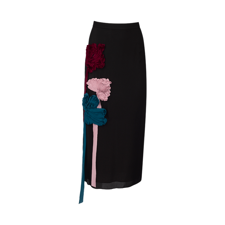 Pencil midi skirt embellished with flowers, center back vent and center back hook, eye and zip fastening. Lined.