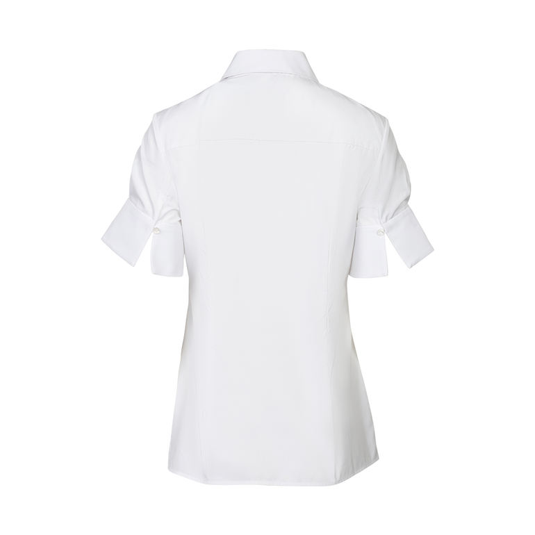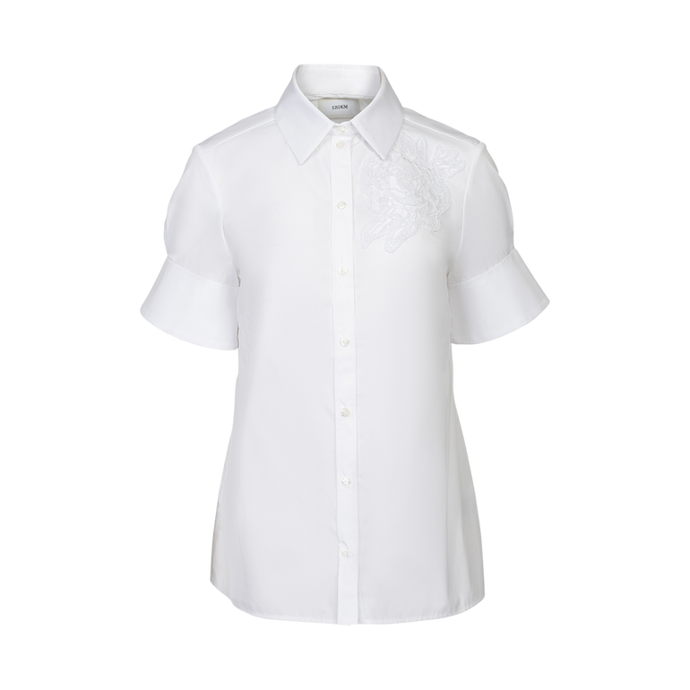 Tailored shirt with point collar, short sleeves, button front and floral appliqué at shoulder.
