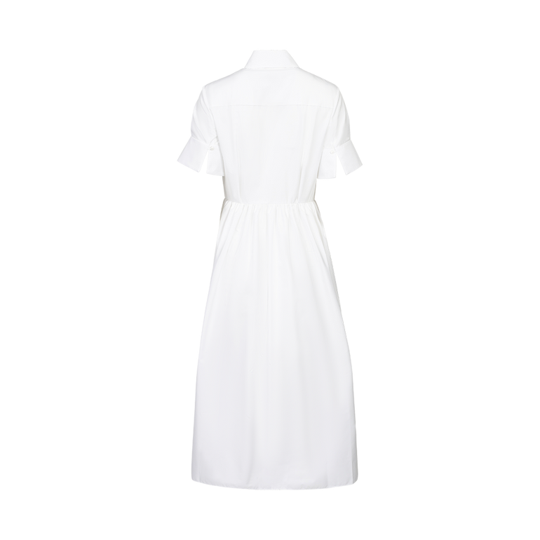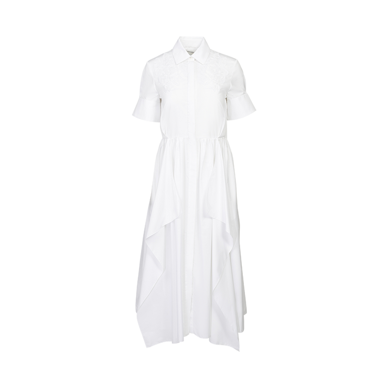 Short-sleeved shirtdress in fit-and-flare silhouette with point collar and flower patch at shoulder.