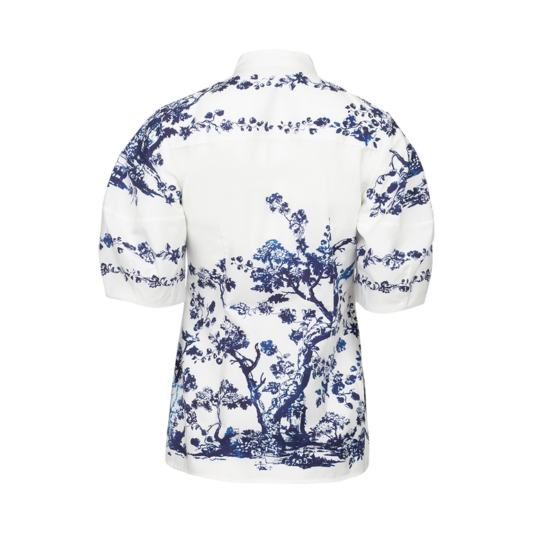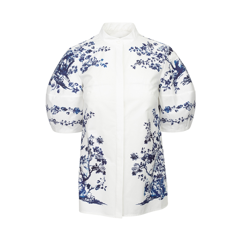 Shirt with stand collar, short puff sleeves and concealed button front.