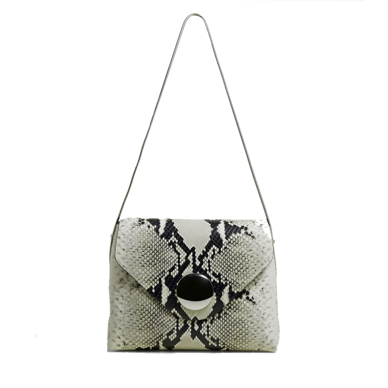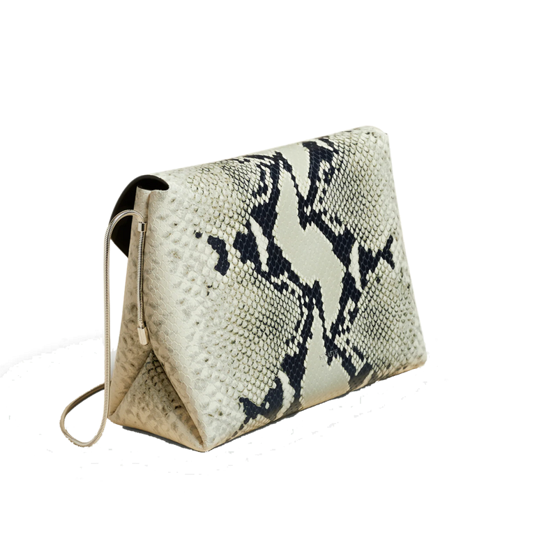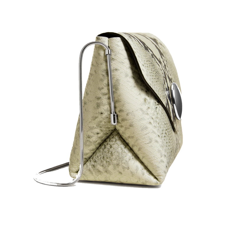 Sculpted envelope bag accented with lift-clasp magnetic closure, with a gleaming disc at its front flap. clutch bag with lift-clasp closure, three interior card slots and protective feet. Approx. 6"H x 3"W x 8"L.