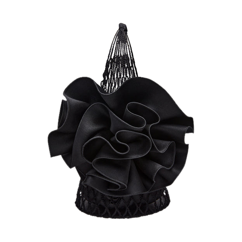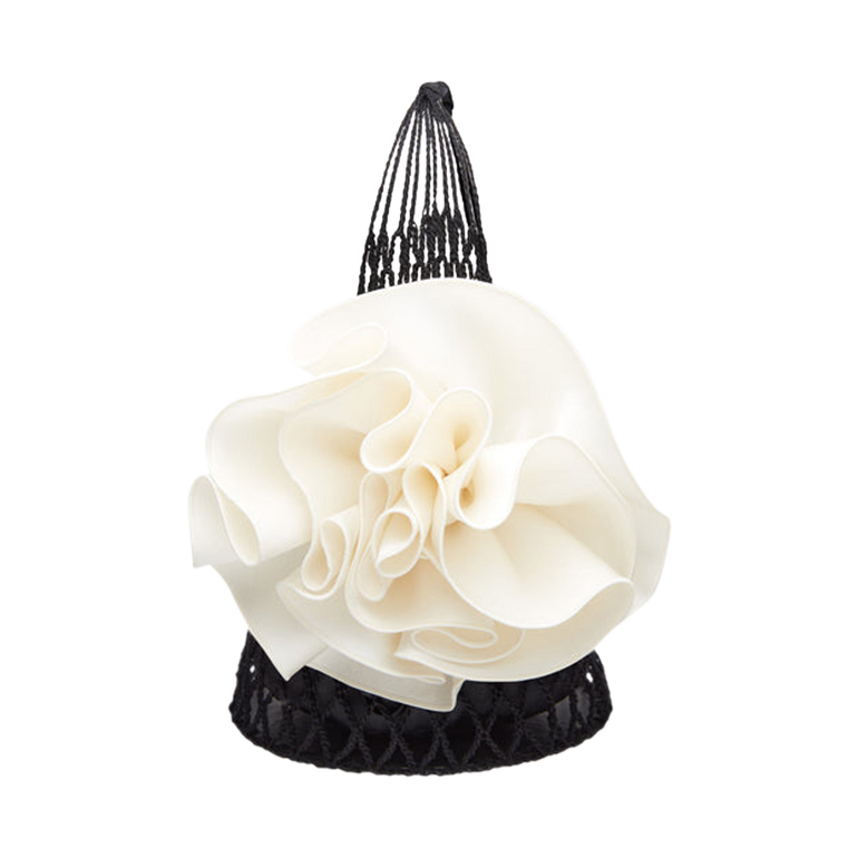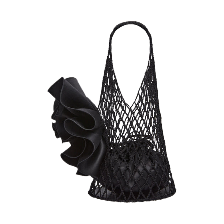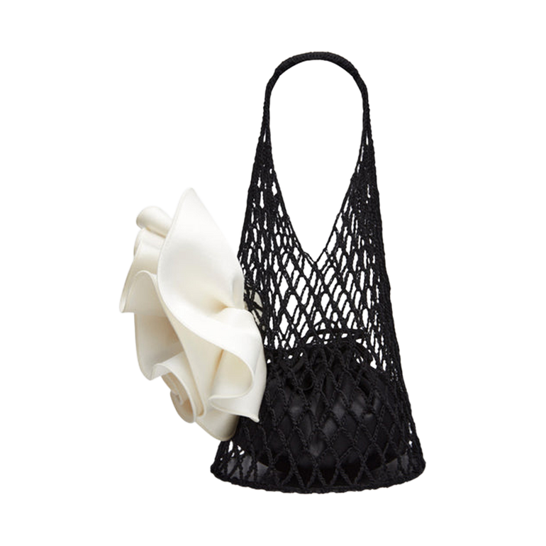 Tote bag made of large netted crochet with large satin flower adornment. Approx. 10.6"H.