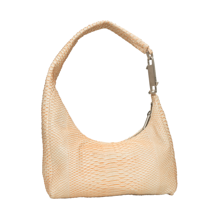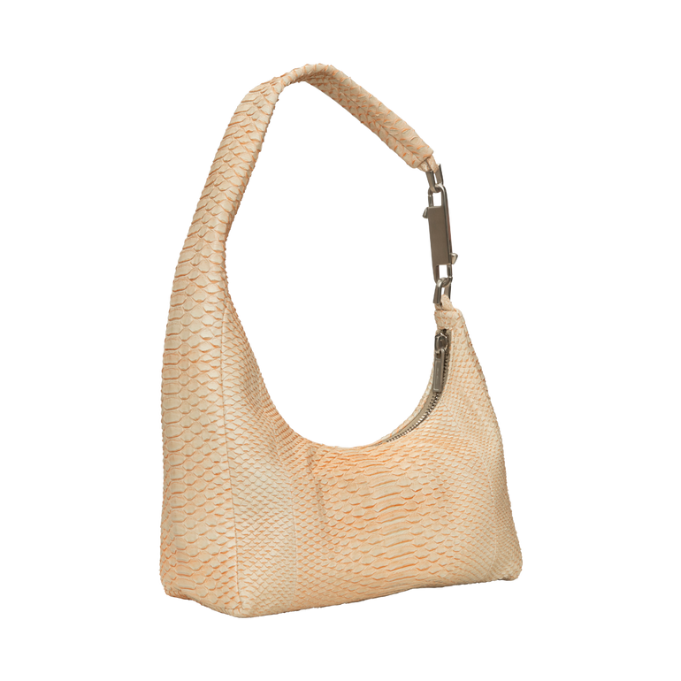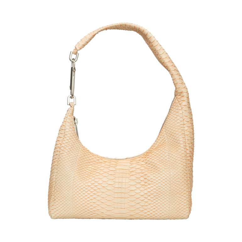 Small, cropped hobo bag that slouches in the middle with double-ended snap hook closure, top zipper, one main pouch and inner, zippered, hanging pocket. Approx. 18.11"W x 8.66"H x 4.72"D.