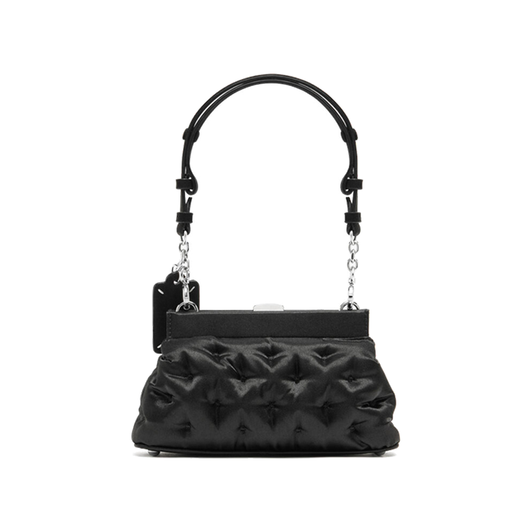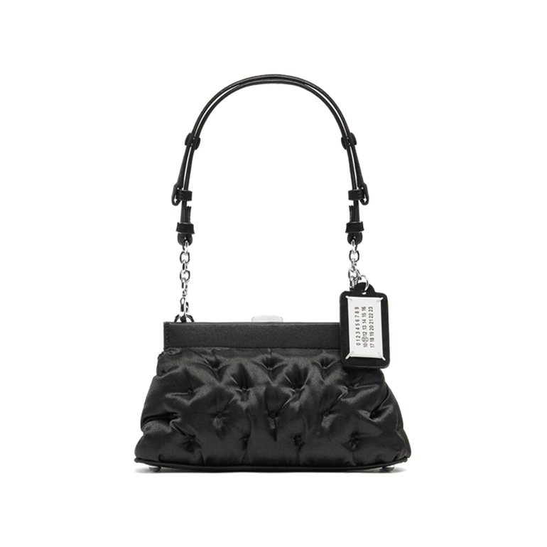 Evening bag with top handles, detachable chain strap, internal pocket with mirror and numeric signature tag at front. Approx. 9.8"L x 5.3"W x 7.1"H.