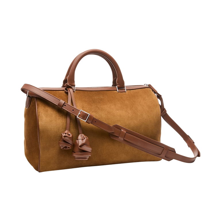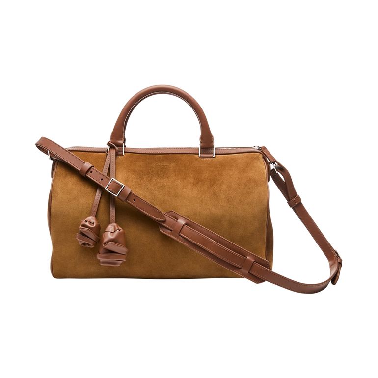 Structured bag with double top handles, detachable crossbody strap, detachable flower charm and zip closure. Approx. 7.9"H x 14.2"W x 7.7"D.