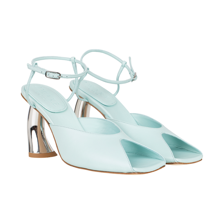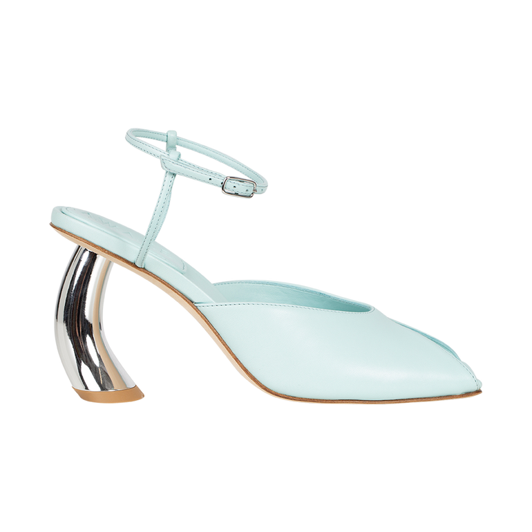 Pump with ankle strap, open toe, buckle fastening and 85MM curved metallic heel.