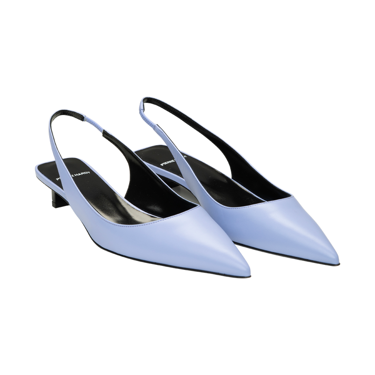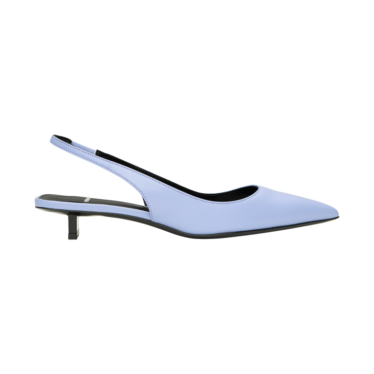 Slingback with fine elastic ankle strap, pointed toe, square back and 25MM blade heel.