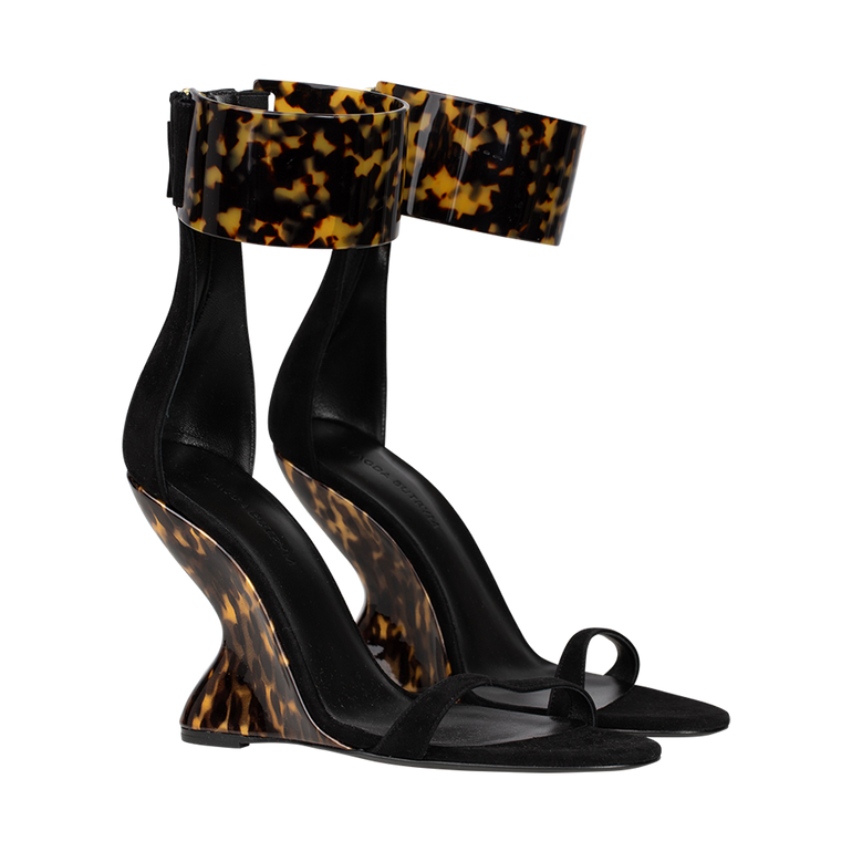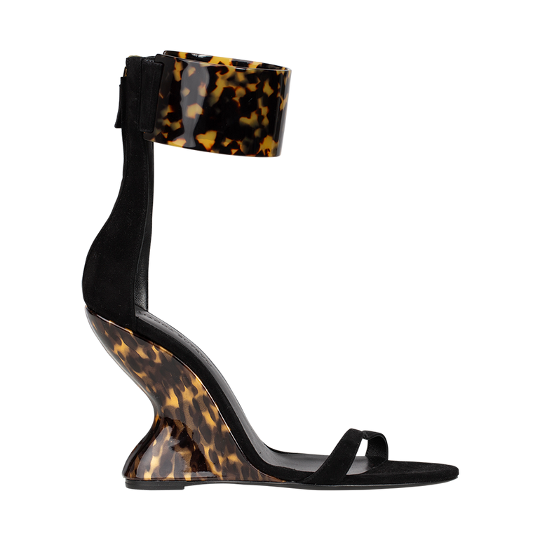Sandals in wedge design with open almond toe, ankle cuff with back zip closure and 105MM heel.