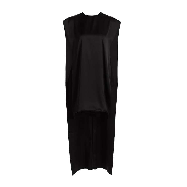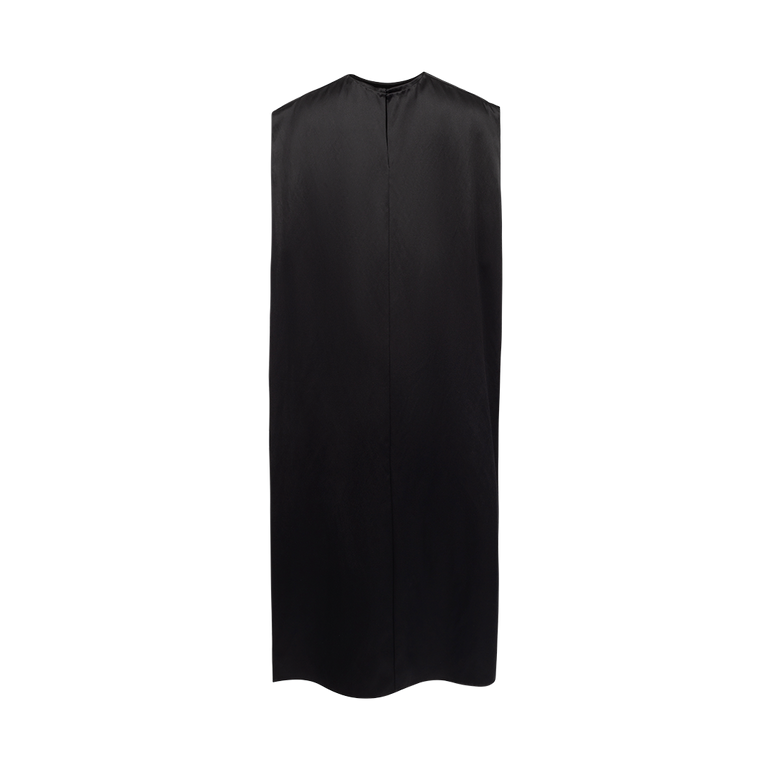 Sleeveless dress with foldover front panel at front hem and drape at neck to create a cape at back.