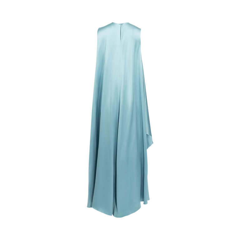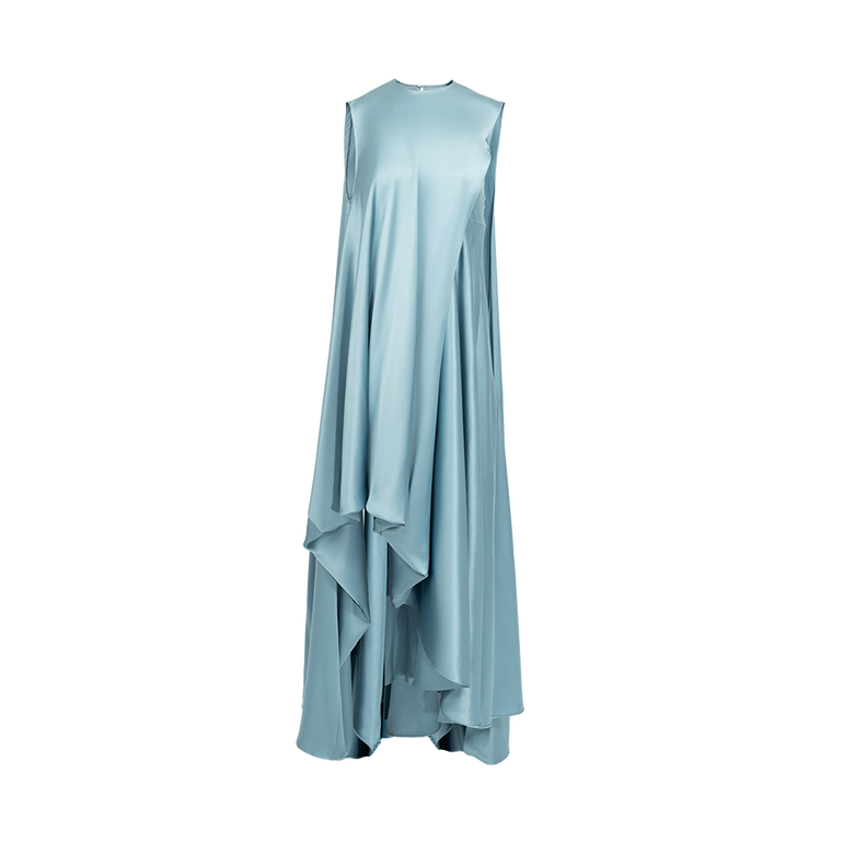 Sleeveless gown with bateau neckline and asymmetric layered hem with train.