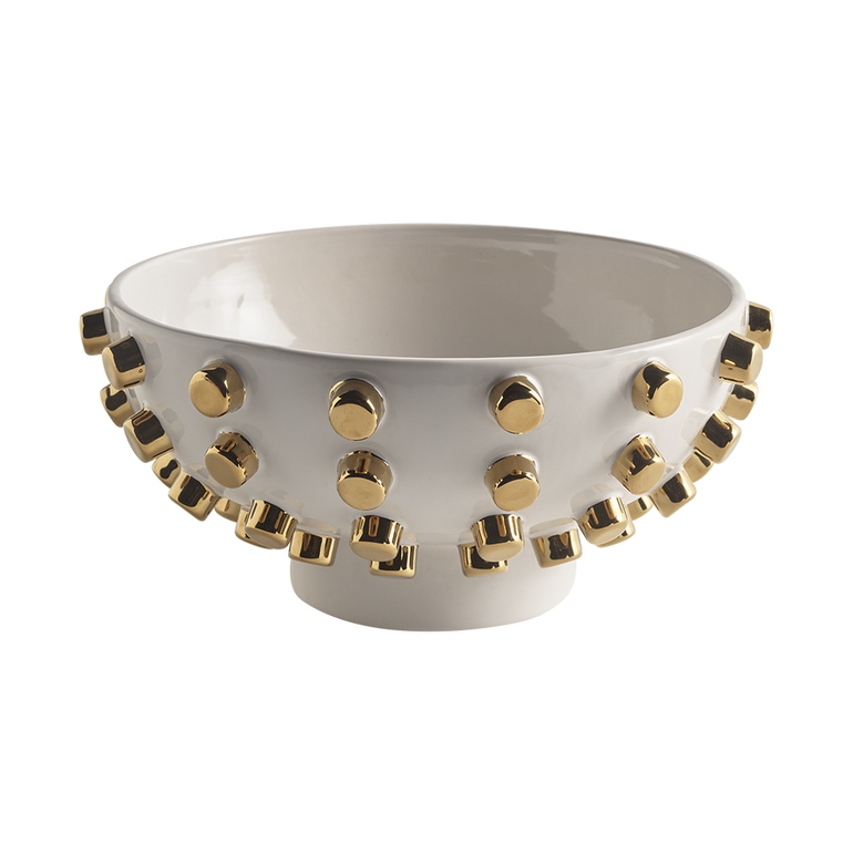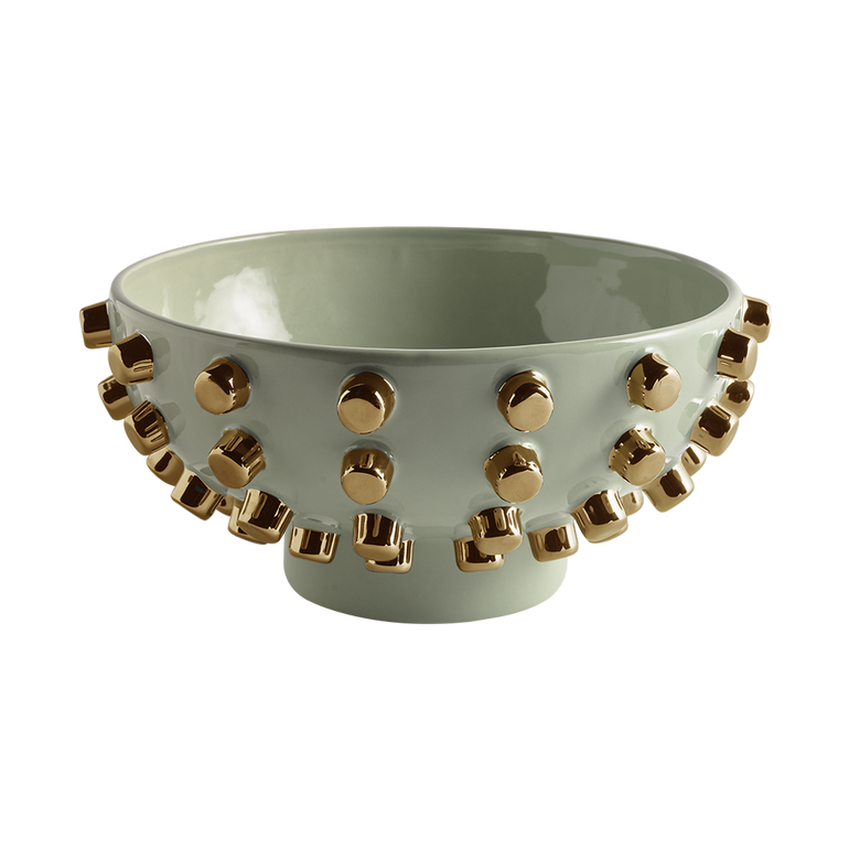 Glazed-ceramic finish in White or sage. Spiked with glittering gold studs. 12.9 x H5.5″″