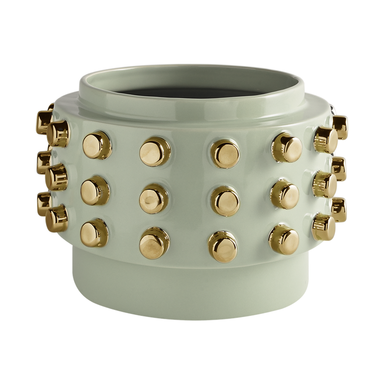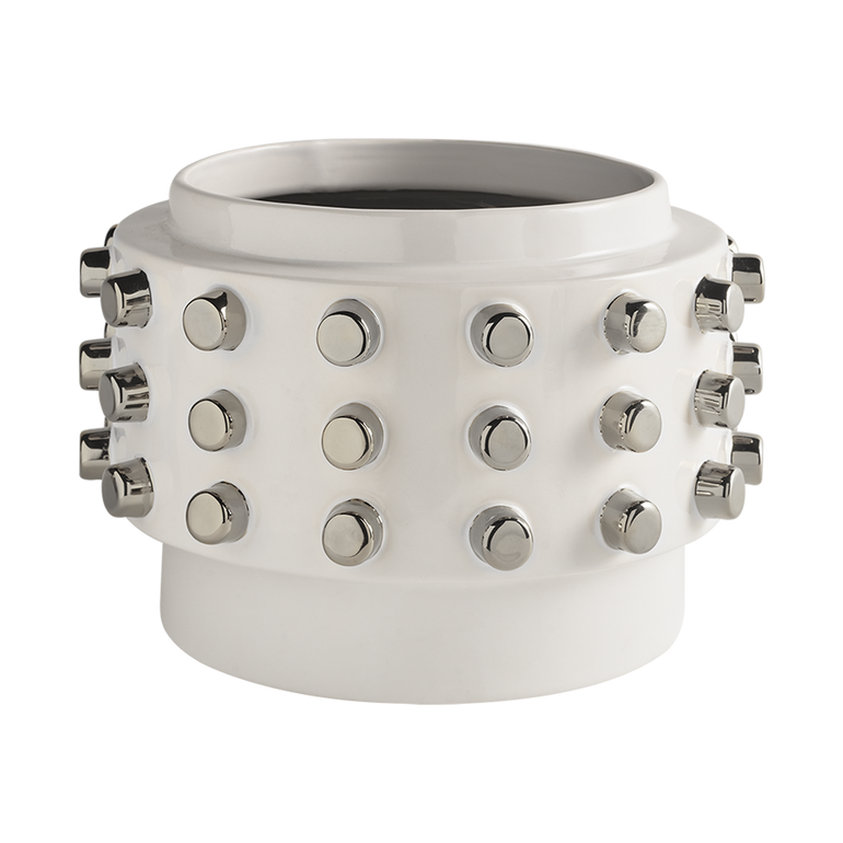 Glazed-ceramic finish in White or sage. Spiked with glittering gold or silver studs. Ø10.9 x H7″