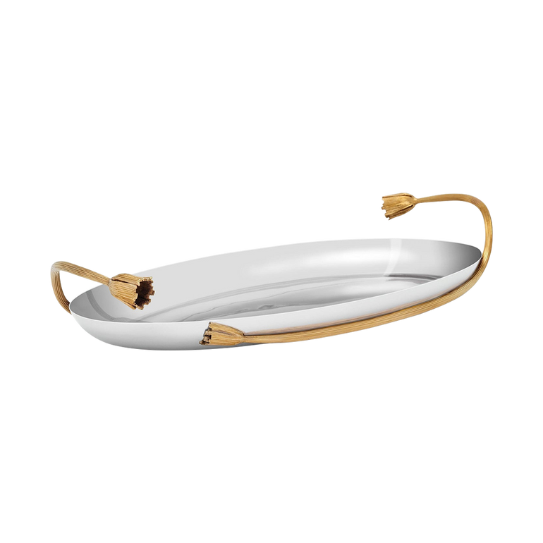 Large serving tray with gold-plated accents. Approx. 19.25"L x 11"W x 3"H.