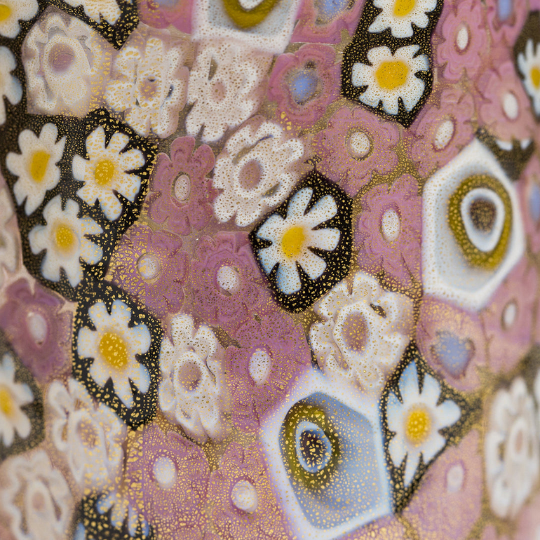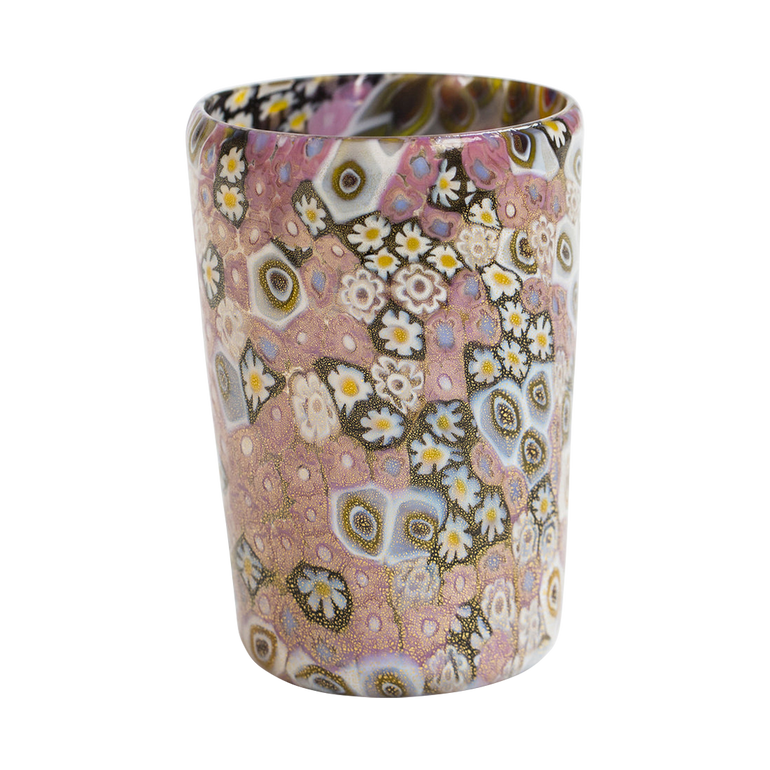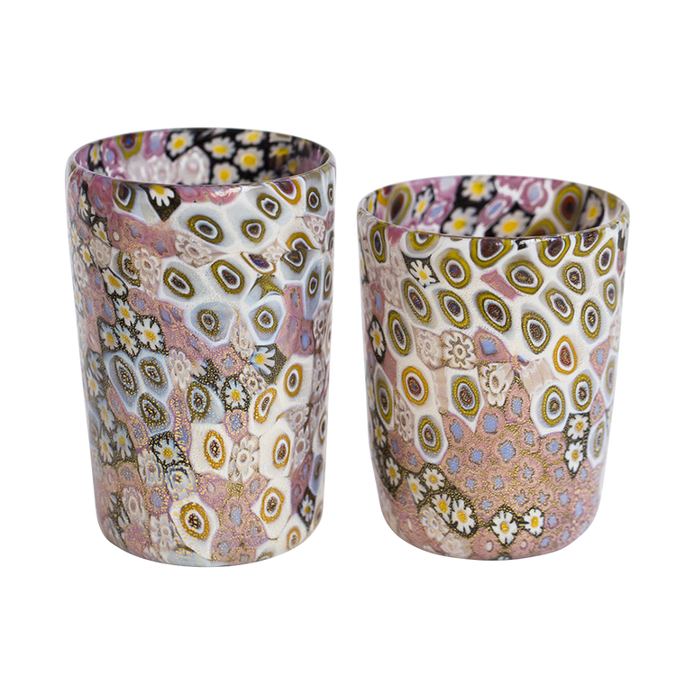Glass made with multicolored "murrine" with a dominant gold and pink cast, each sold individually. Wine glass: Approx. 3.5"H x 2.8"W.Water glass: Approx. 4.7"H x 3.1"W.