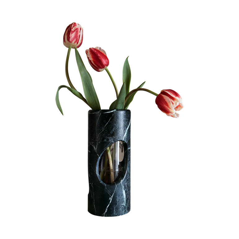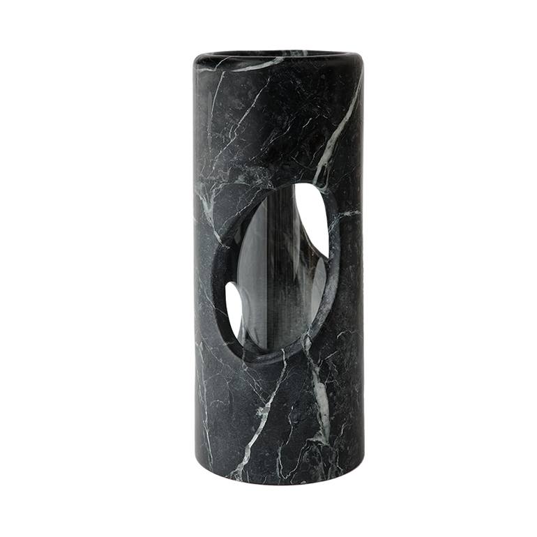 Vase with peek-a-boo cutouts. Approx. 4.7"W x 11"H.