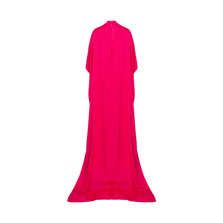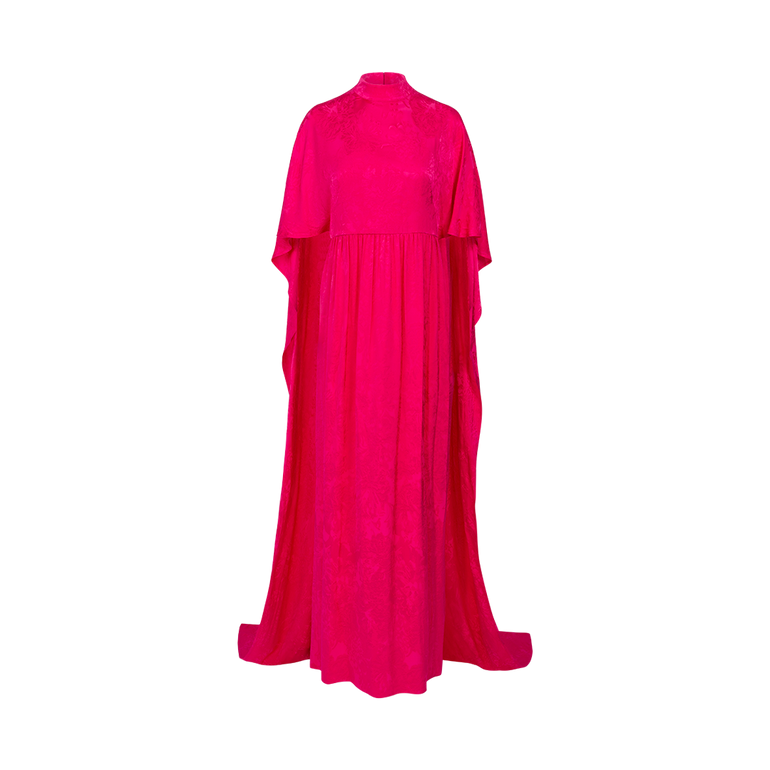 Gown with high neckline, cape sleeves, gathered waist and keyhole opening. Lined.