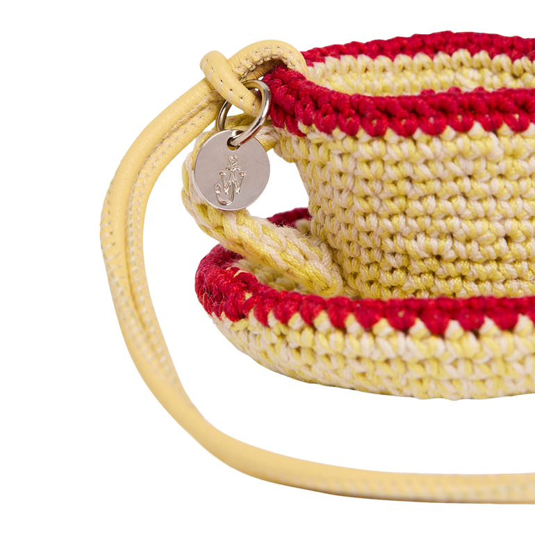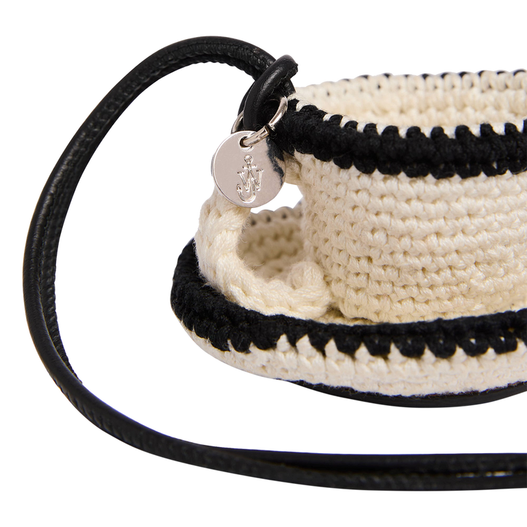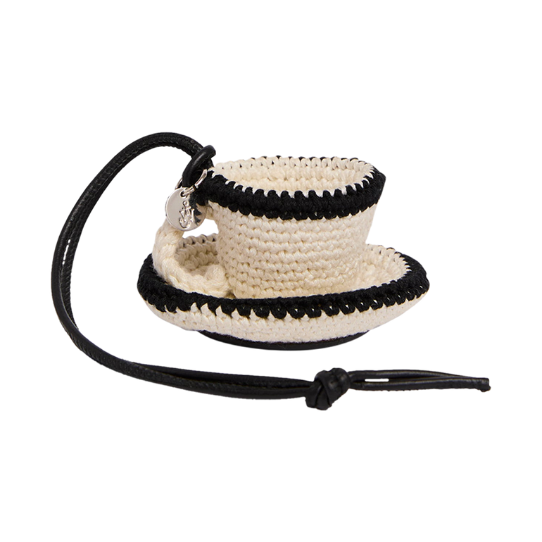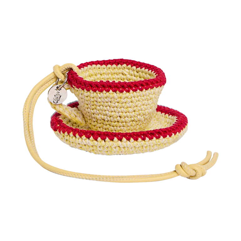 Bag charm in crocheted teacup design. Approx. 3.35"DIA x 1.5"H.
