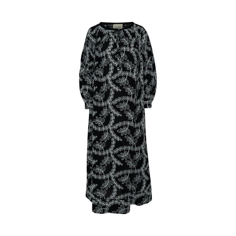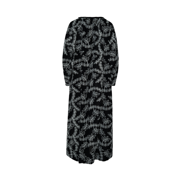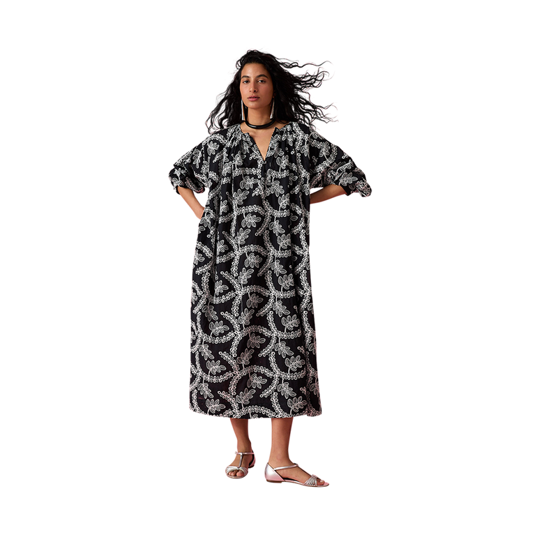 Midi dress with front button-and-keyhole closure and long sleeves with button cuffs.