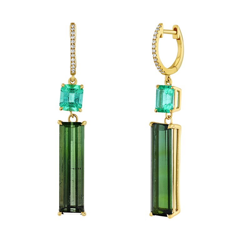 Drop earrings with 1.13 CT. T.W. emerald-cut emeralds, 9.14 emerald-cut green tourmaline and 0.09 CT. T.W. diamond. For pierced ears.