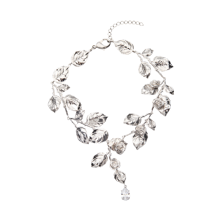 Necklace in cascading vine design featuring sculpted roses, leaves and single faceted crystal drop.