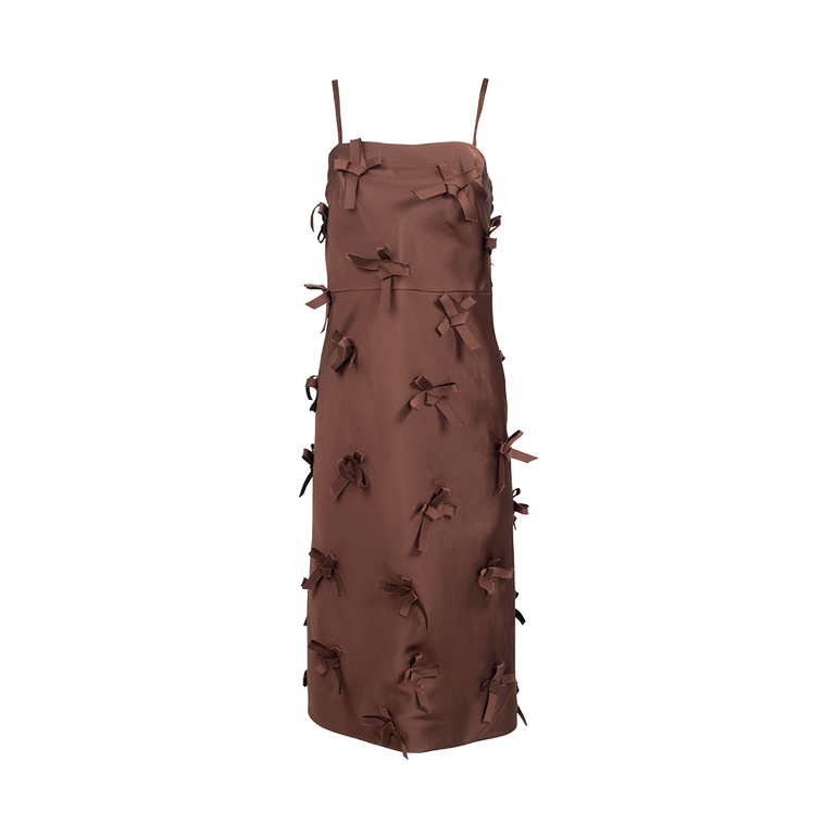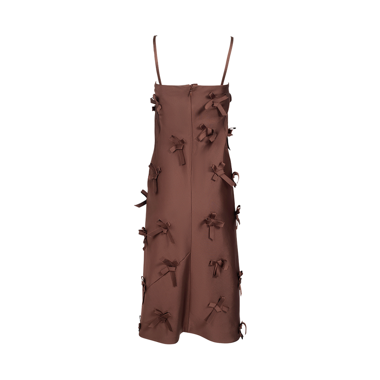 Midi dress with thin straps, straight neckline and embroidered bow details.