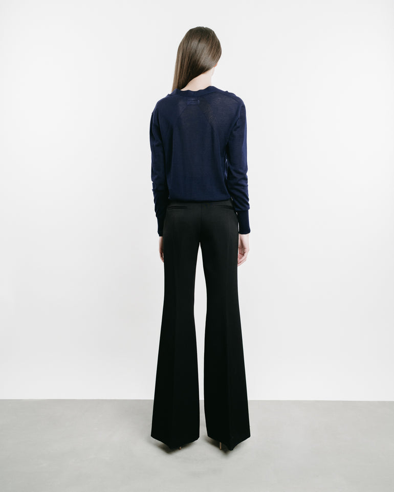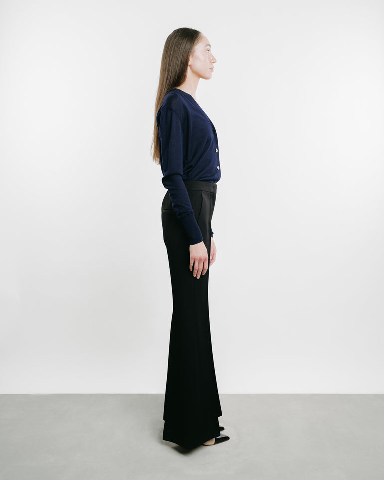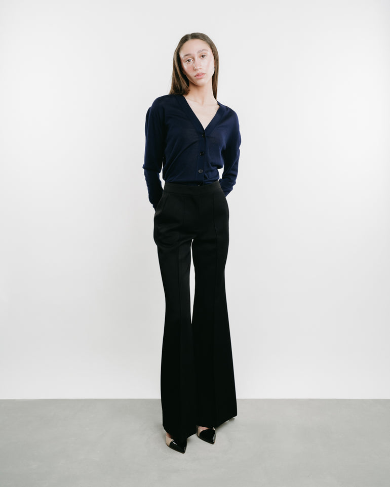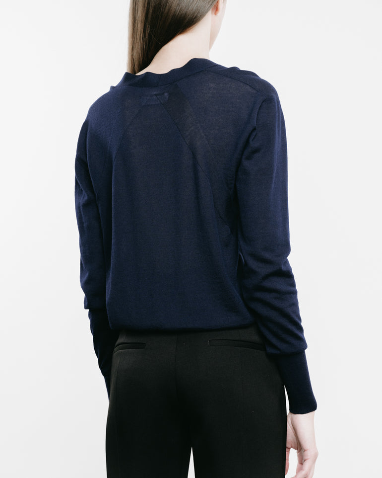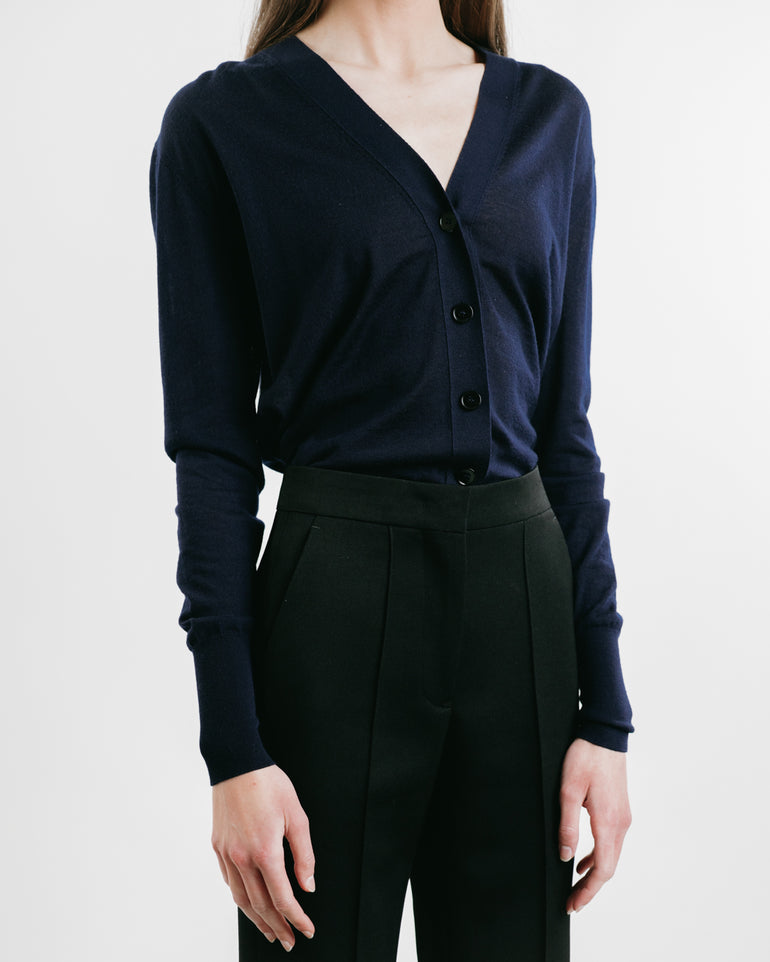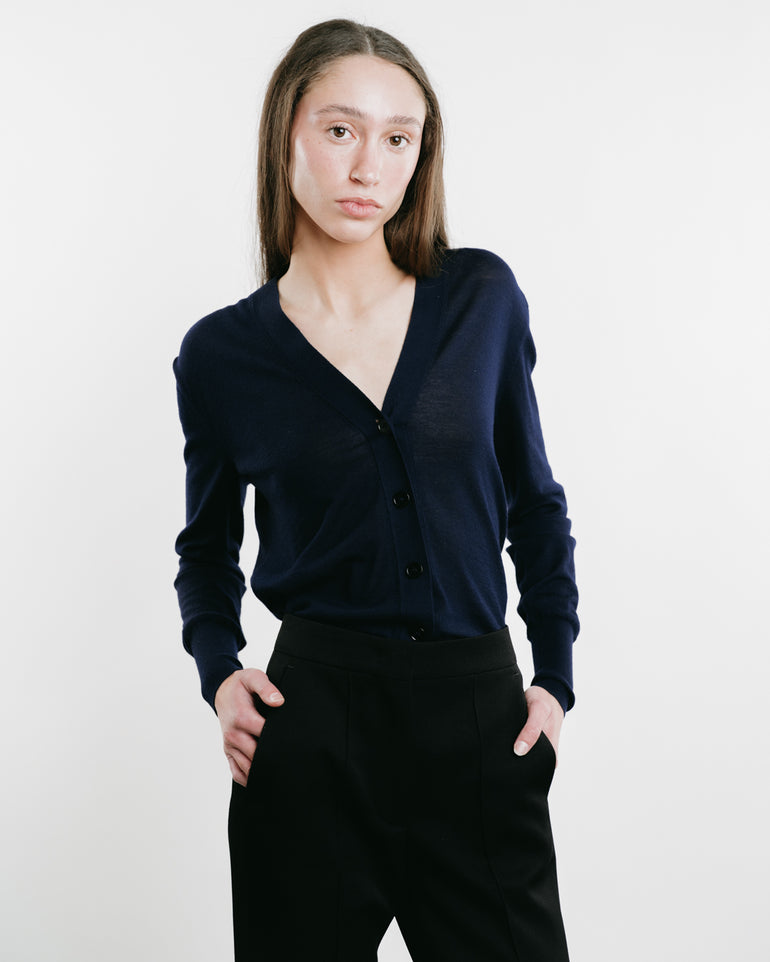 Fine-knit cardigan with V-neckline, button front and long sleeves.