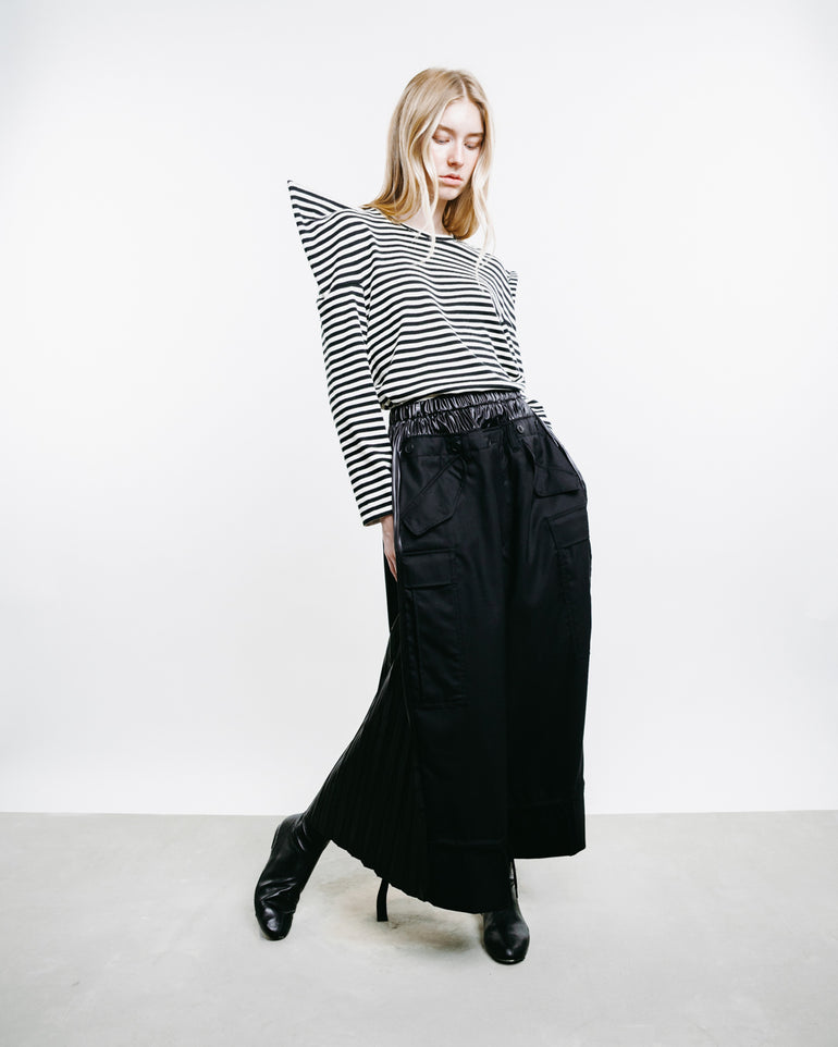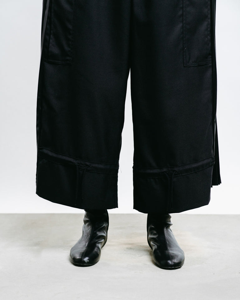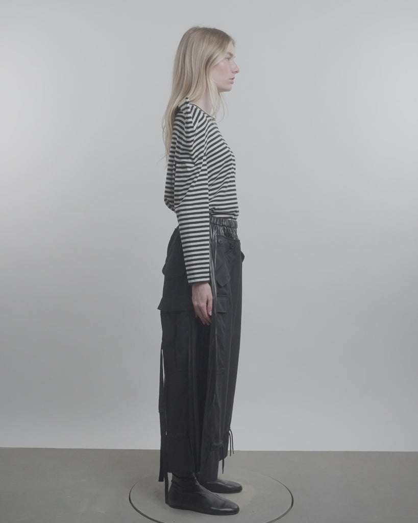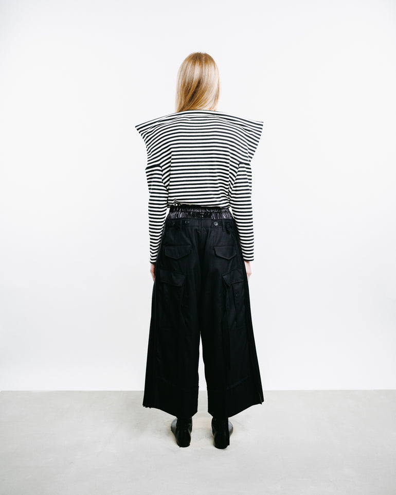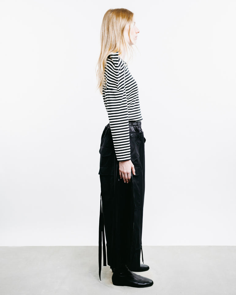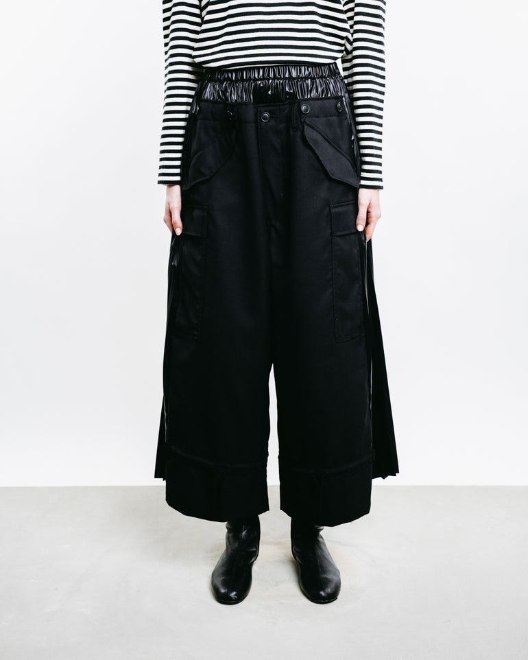 Cropped cargo trousers with pleated elastic waistband and side flap pockets.