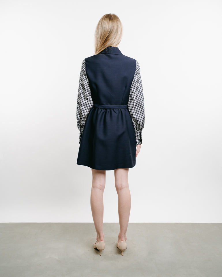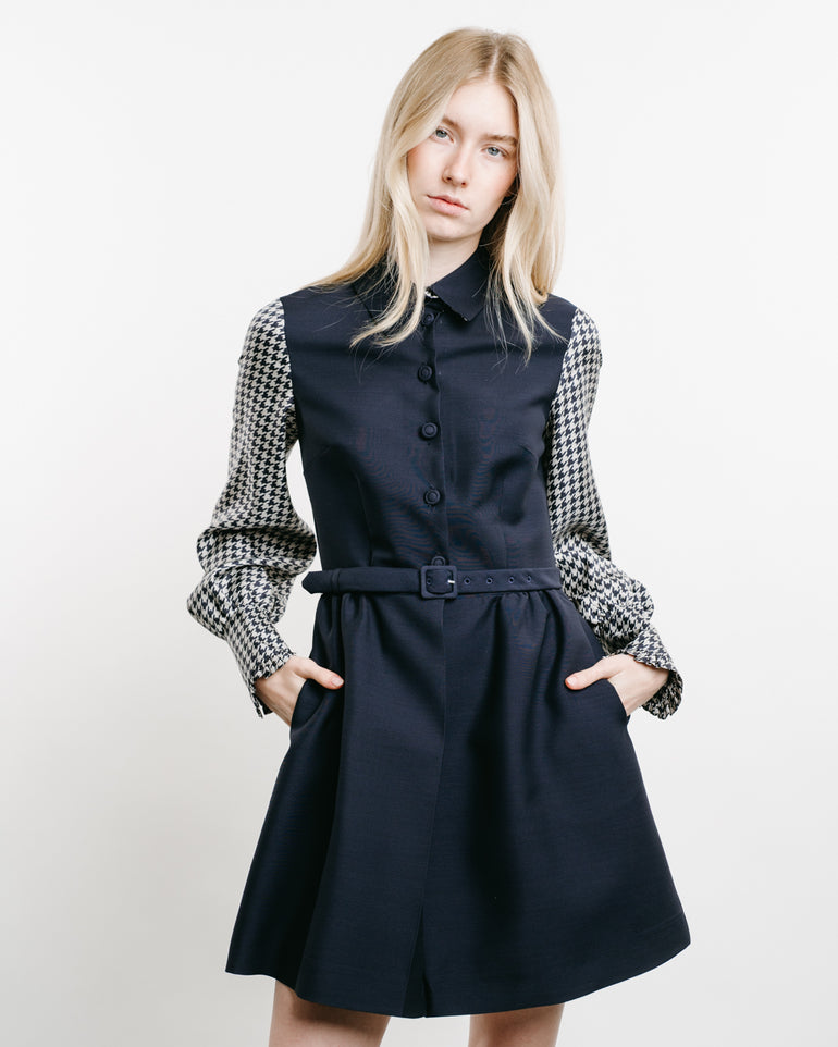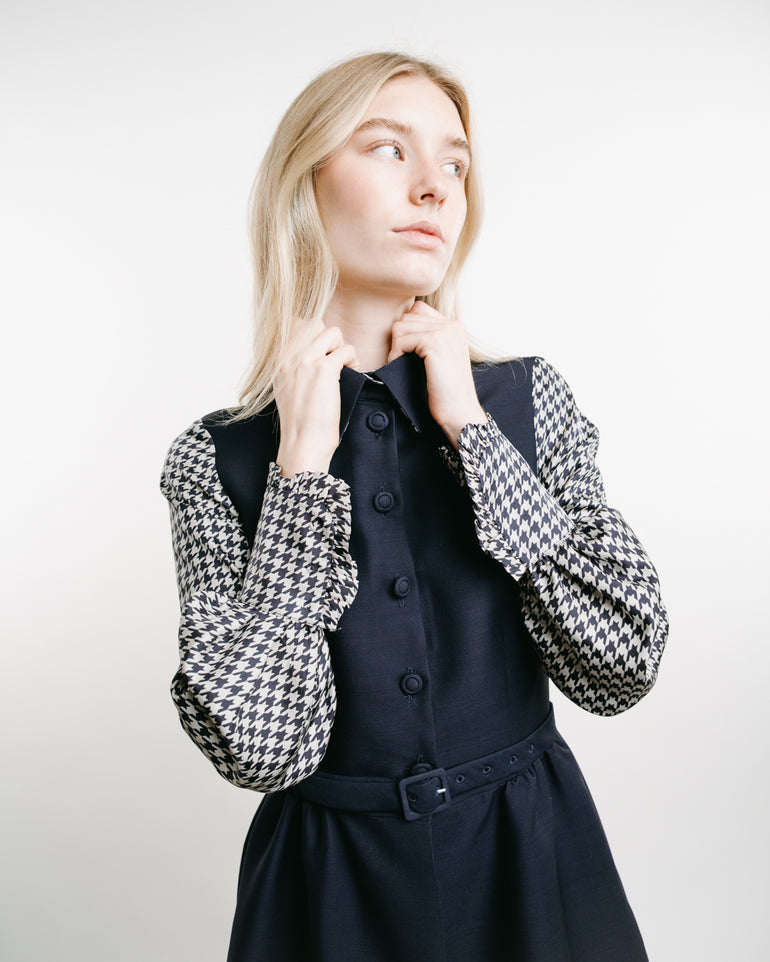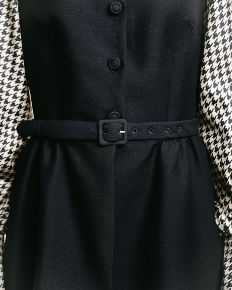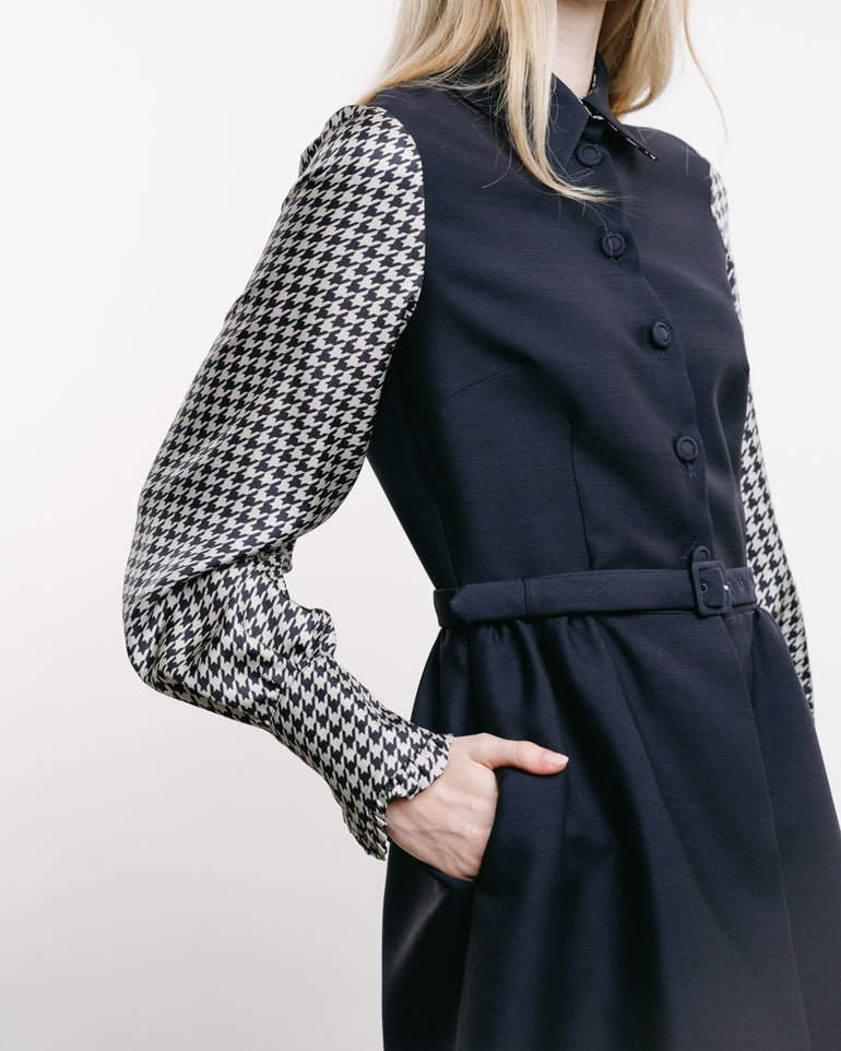 Dress with button front, belted waist and contrast houndstooth sleeves.
