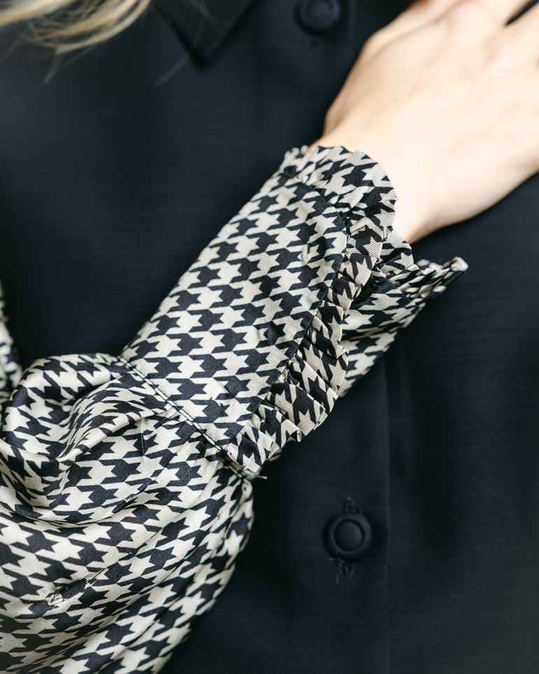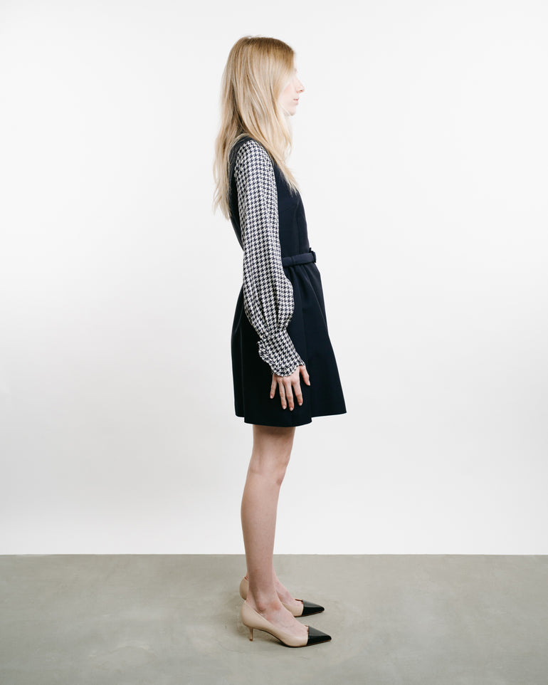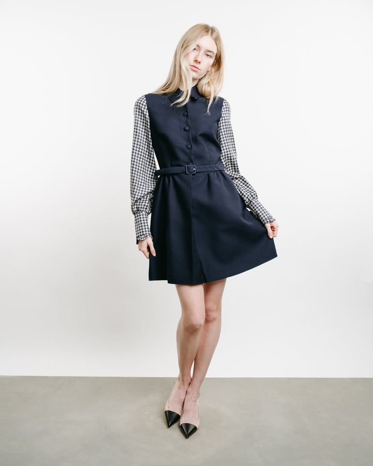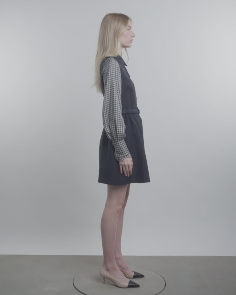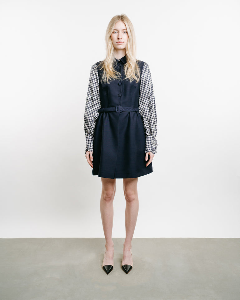 Dress with button front, belted waist and contrast houndstooth sleeves.