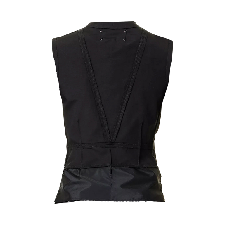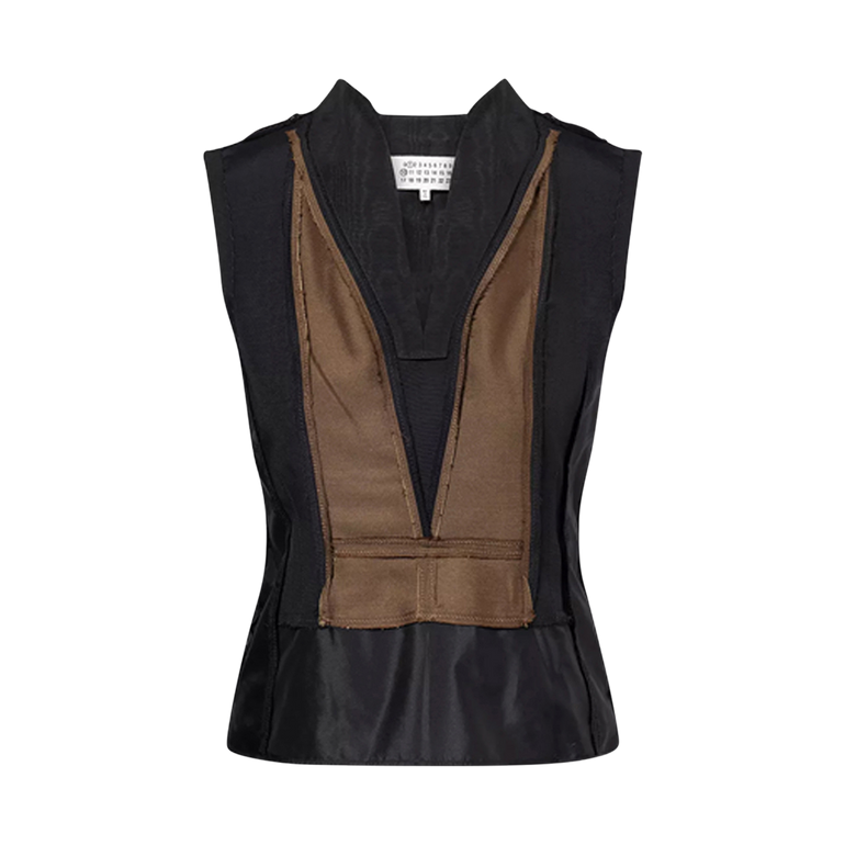 Sleeveless top with contrast panels at front, V-neckline, exposed stitching and split at sides.