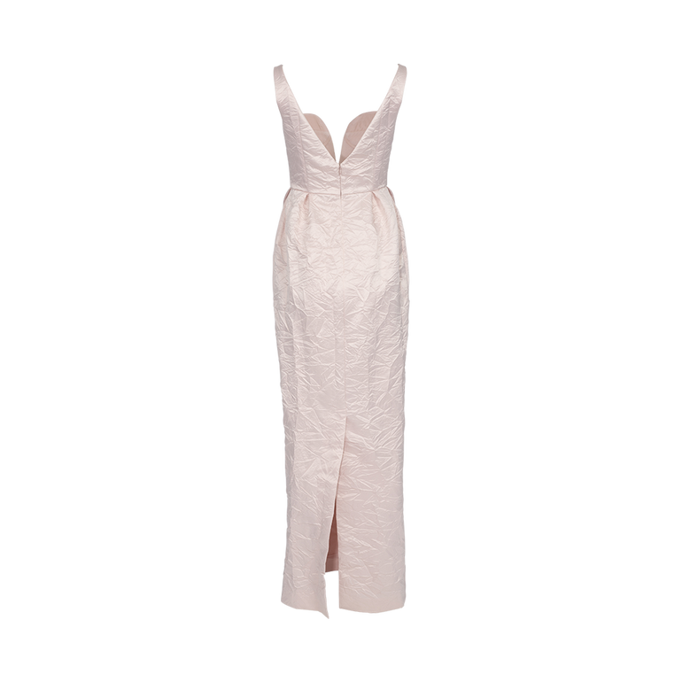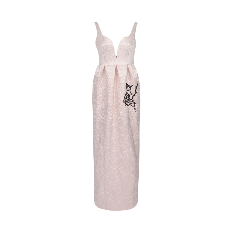 Gown in pencil silhouette with plunging neckline, embroidered rose and center back vent. Lined.
