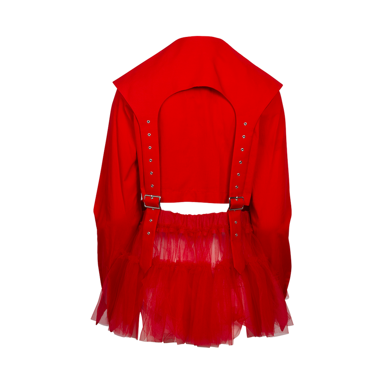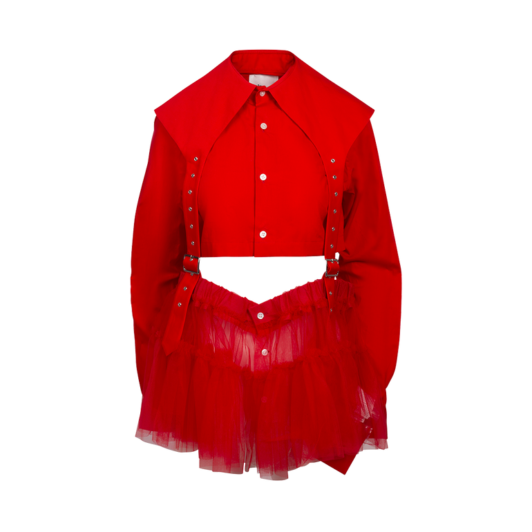 Long-sleeved top with button front and attached garter belt-inspired buckles with attached tulle skirt.