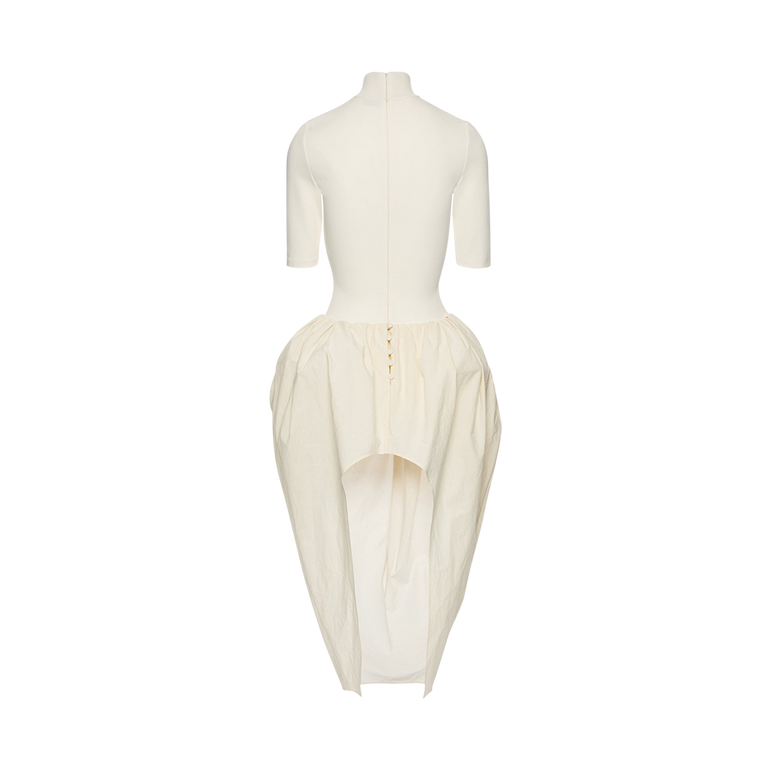 Form-fitting midi dress with turtleneck, three-quarter sleeves and voluminous skirt with high slit at back.