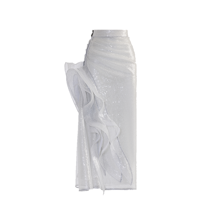 Sequined midi skirt with dramatic asymmetrical ruffle detail and back zip. Lined.