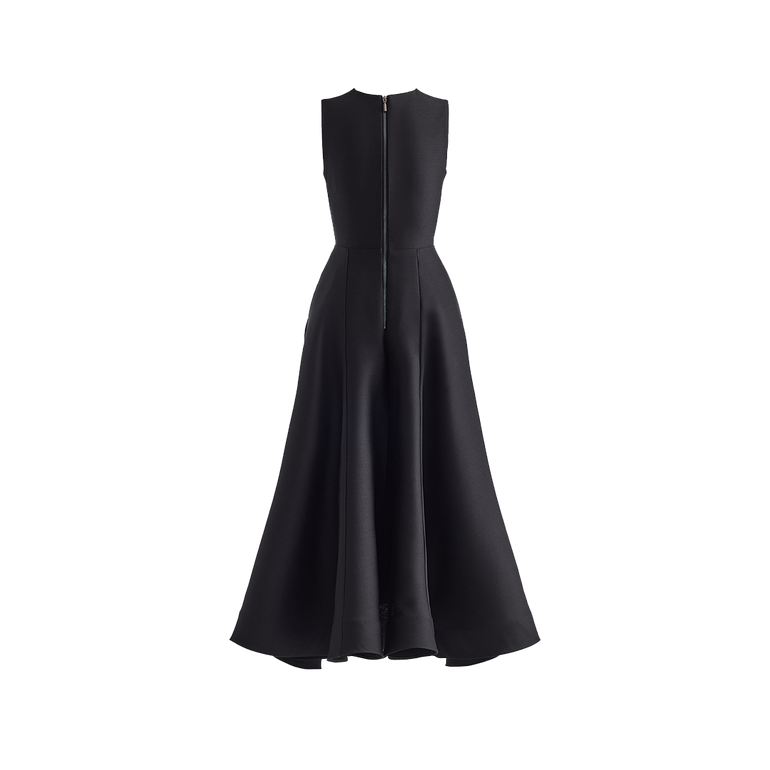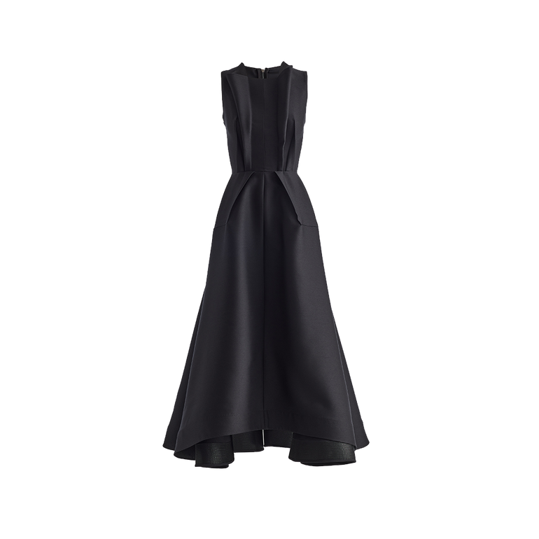 Sculpted midi dress with architectural pleating, high-low hem and back zip. Lined.