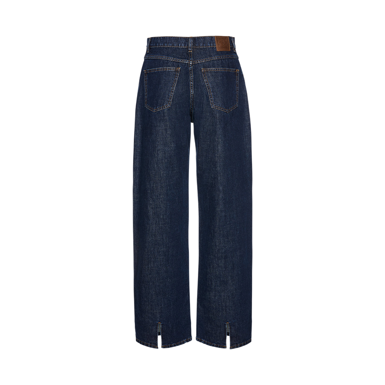 Jeans with mid-rise waist, five-pocket styling and small back hem slits.