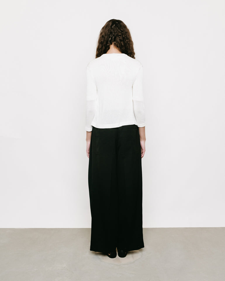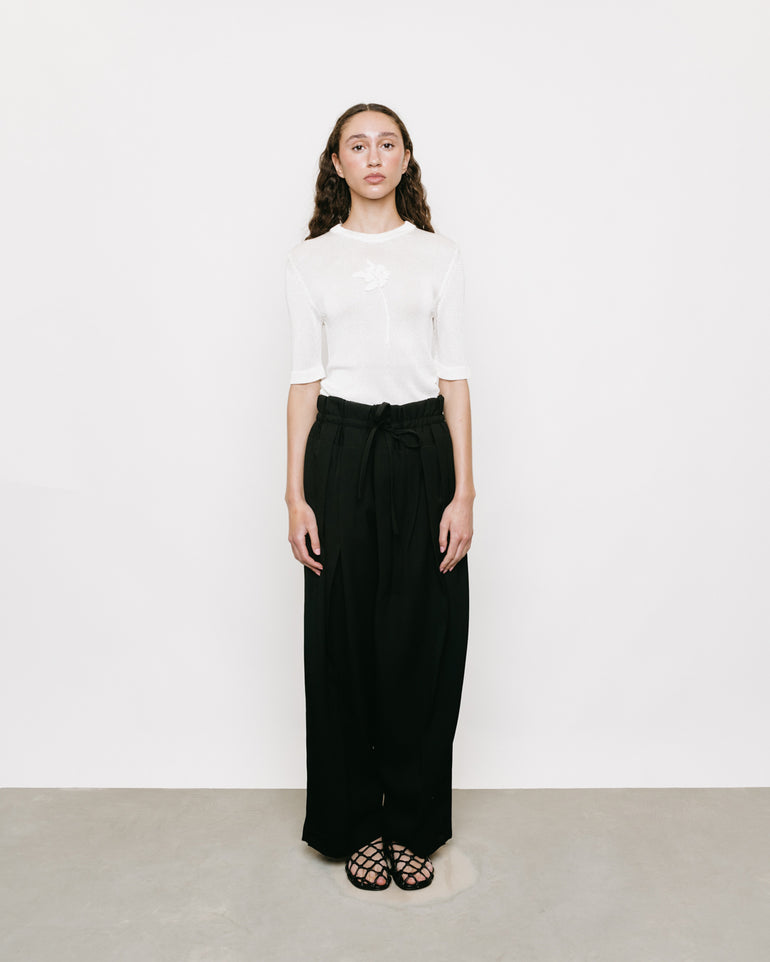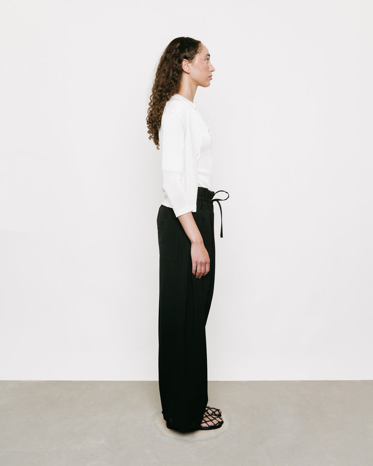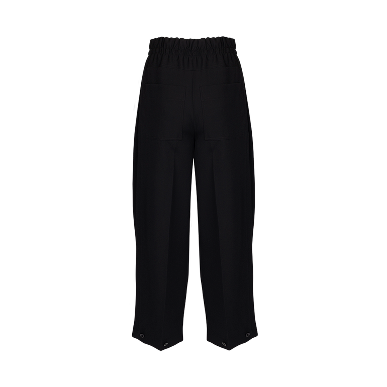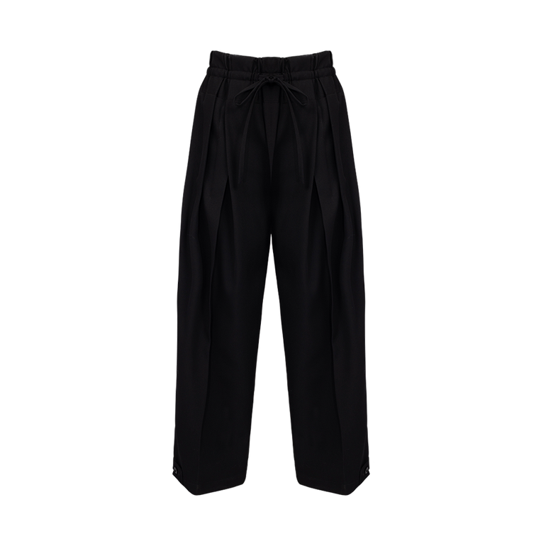 Pleated pants with wide legs, drawstring paperbag waist and cuff tabs.