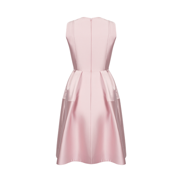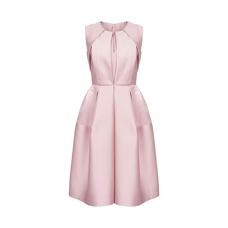 Sleeveless cocktail dress in sculptural silhouette with pleat detailing and concealed side pockets.