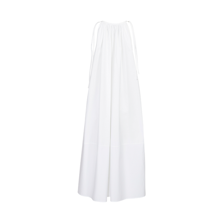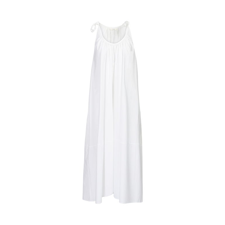 Maxi dress with gathered scoop neckline, tie shoulder straps and side split pockets.