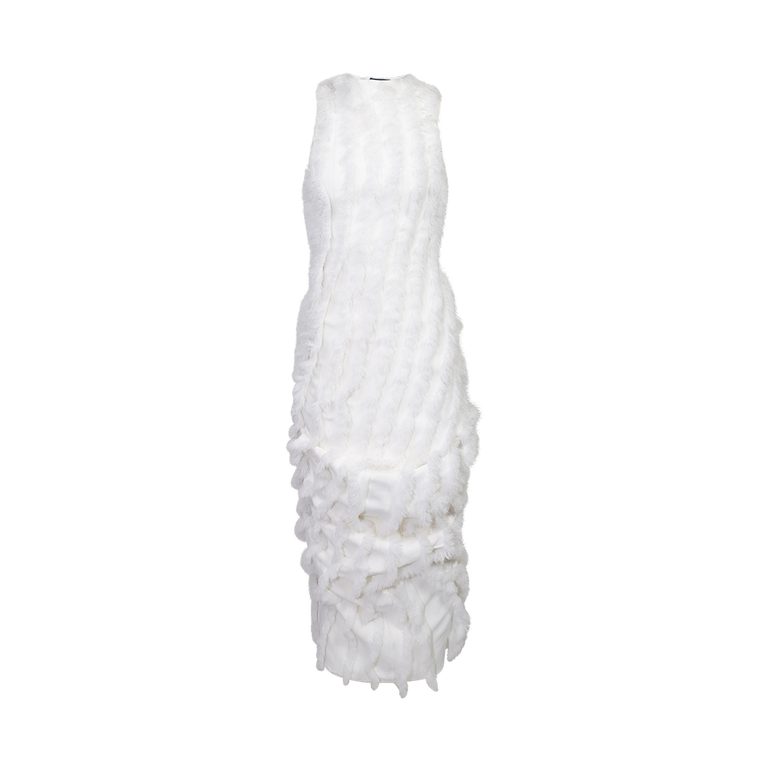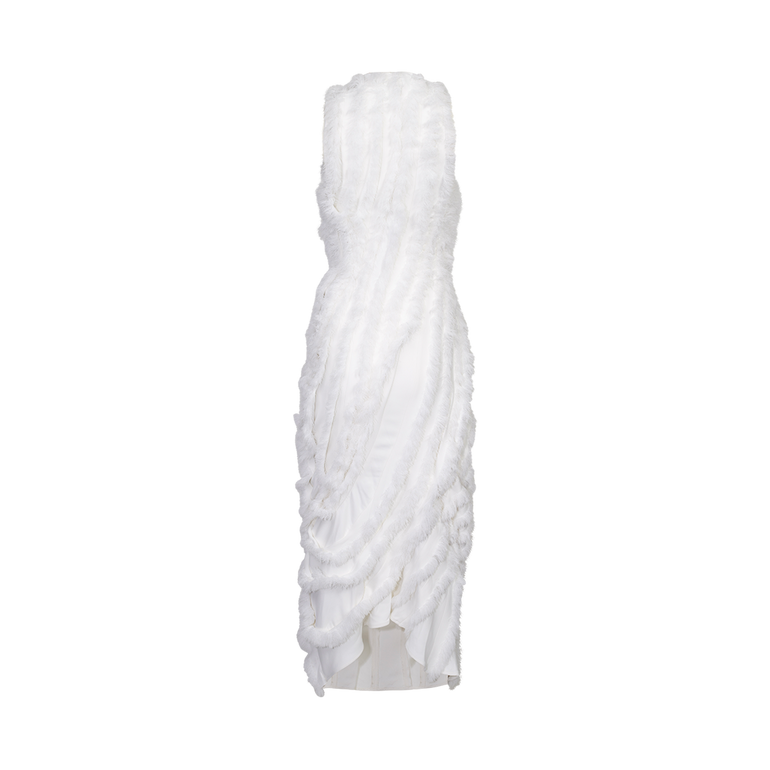 Frayed column dress with high neckline, sleeveless and concealed back zip with snap button.