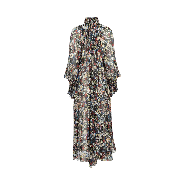 Maxi dress with high stand collar, billowing sleeves with cinched wrists and slit neckline that can be worn at front or back.