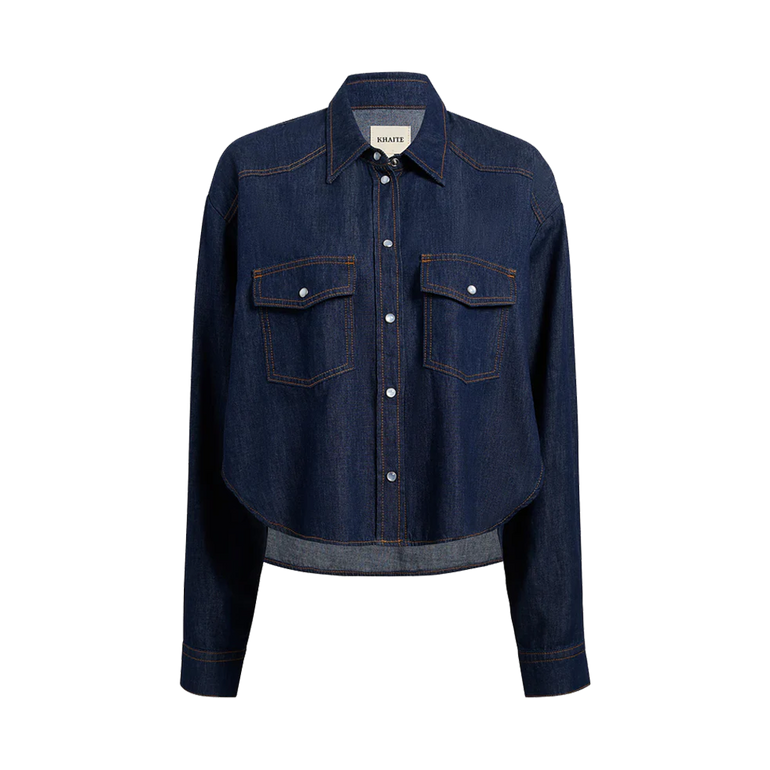 Shirt in asymmetric silhouette with classic collar, snap-button front and snap-button pockets.