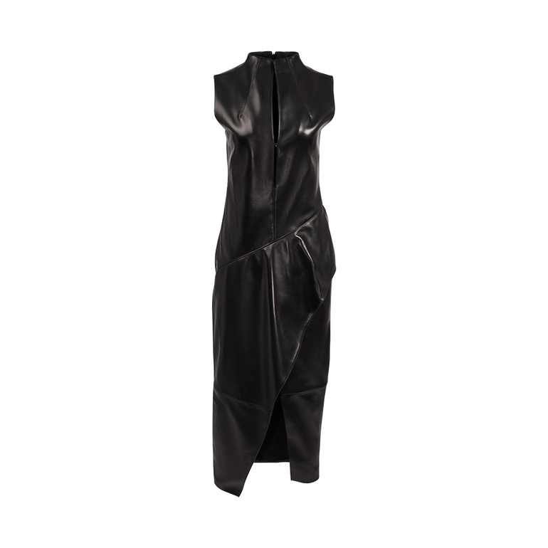 Sleeveless dress with stand collar, deep front slit, draped panels on the bias and concealed back zip.
