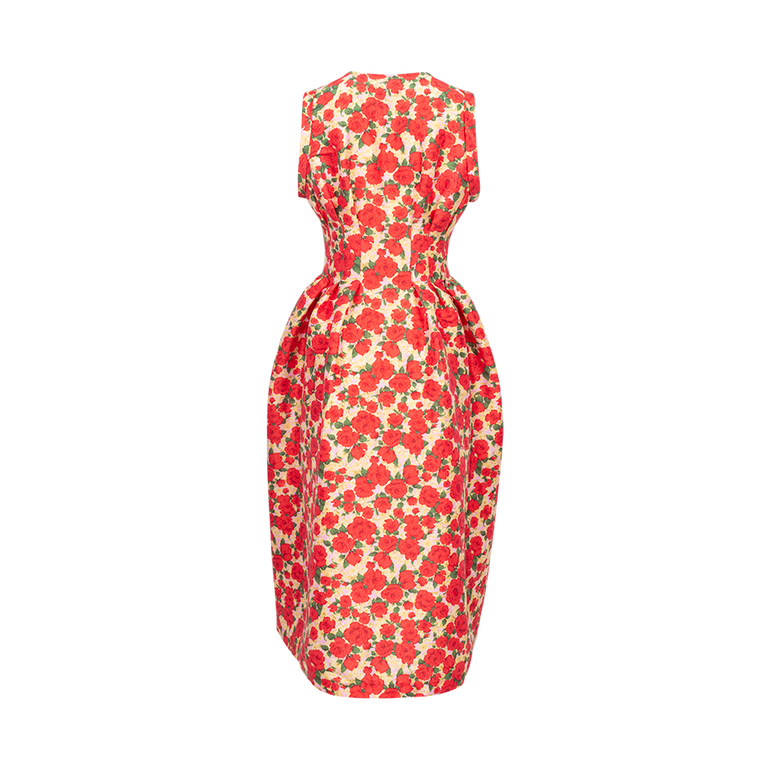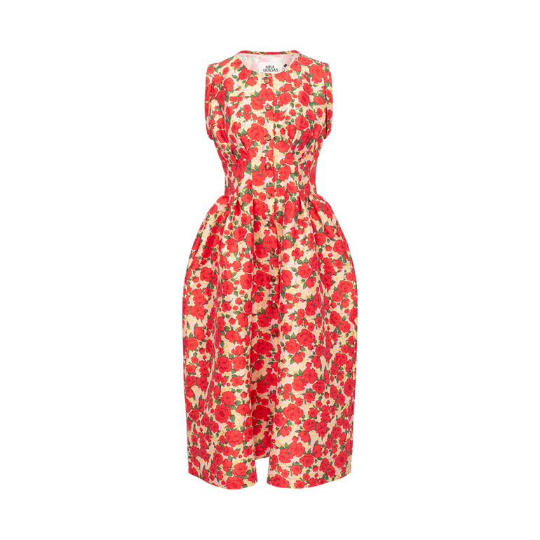 Sleeveless midi dress with fitted bodice, side-seam pockets and concealed back zip.