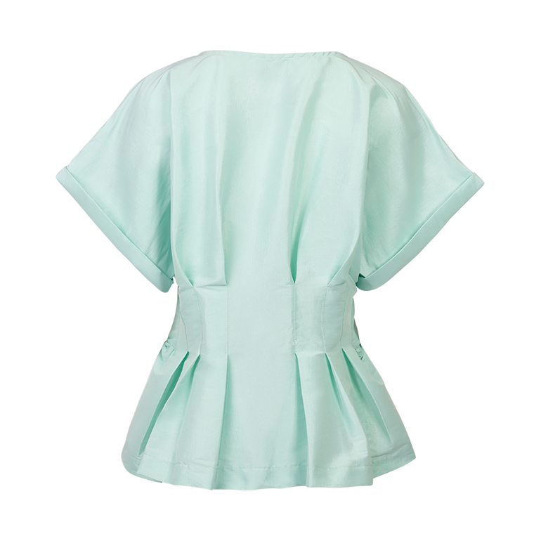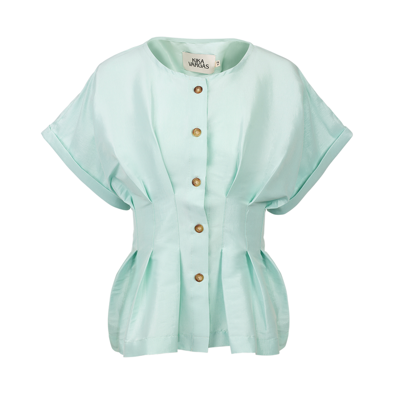 Short-sleeved top with button front, cinched waist and ruffle details.