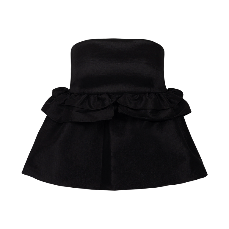 Strapless top with empire waist and ruffle details.